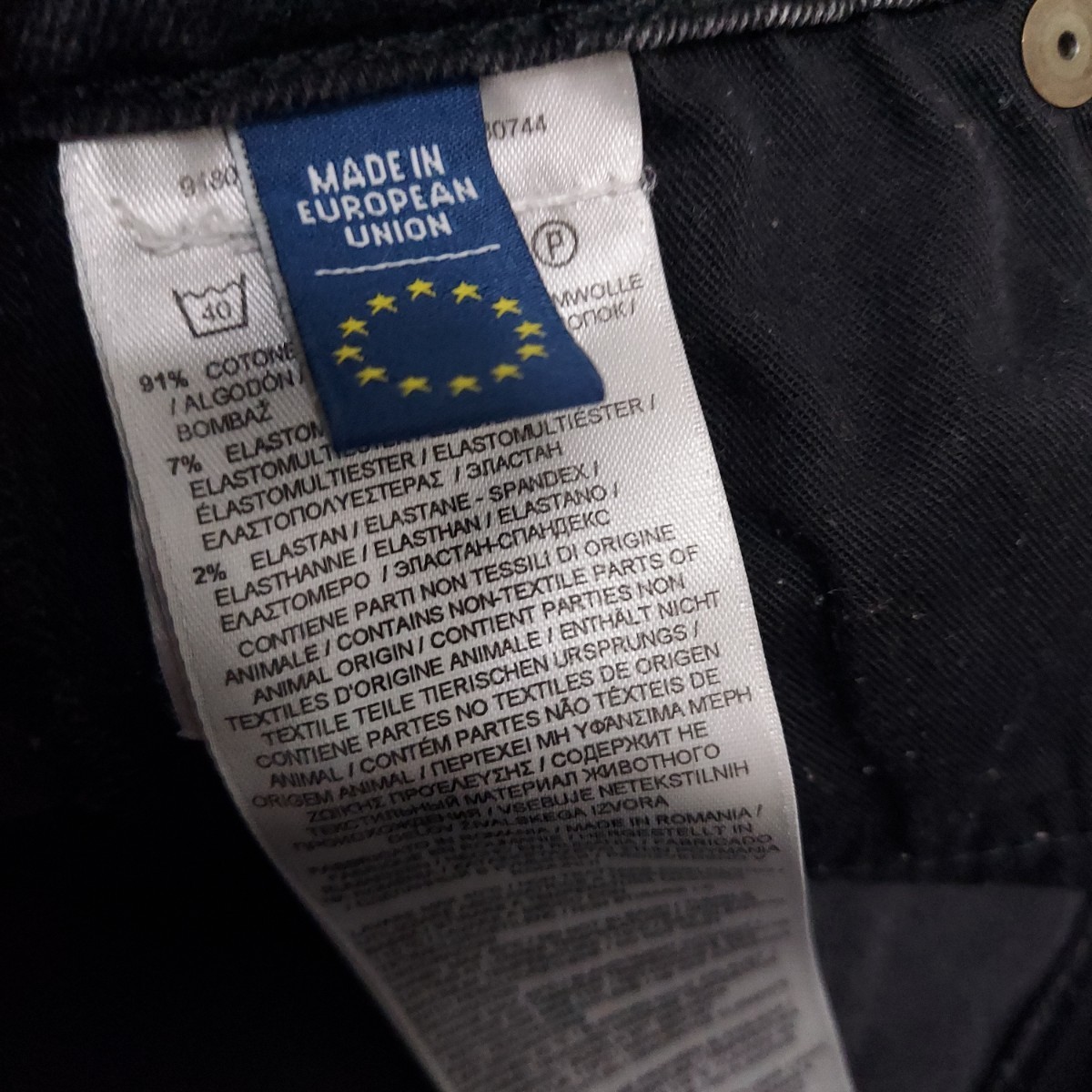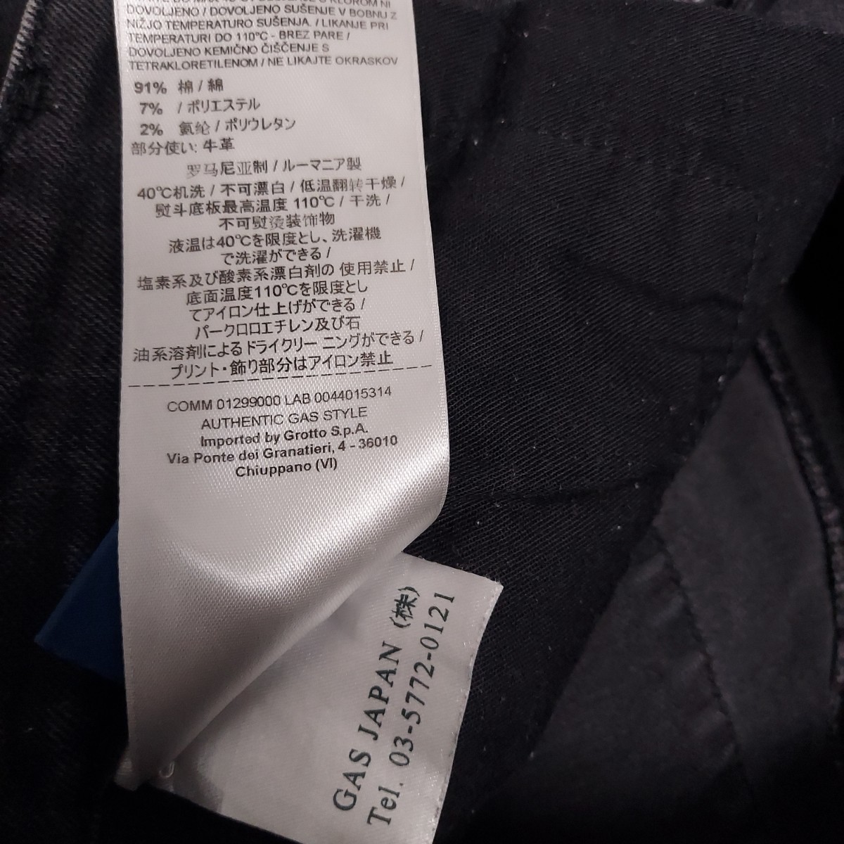 コットン91%、ポリエステル7%、ポリウレタン2%、ラベル:牛革
