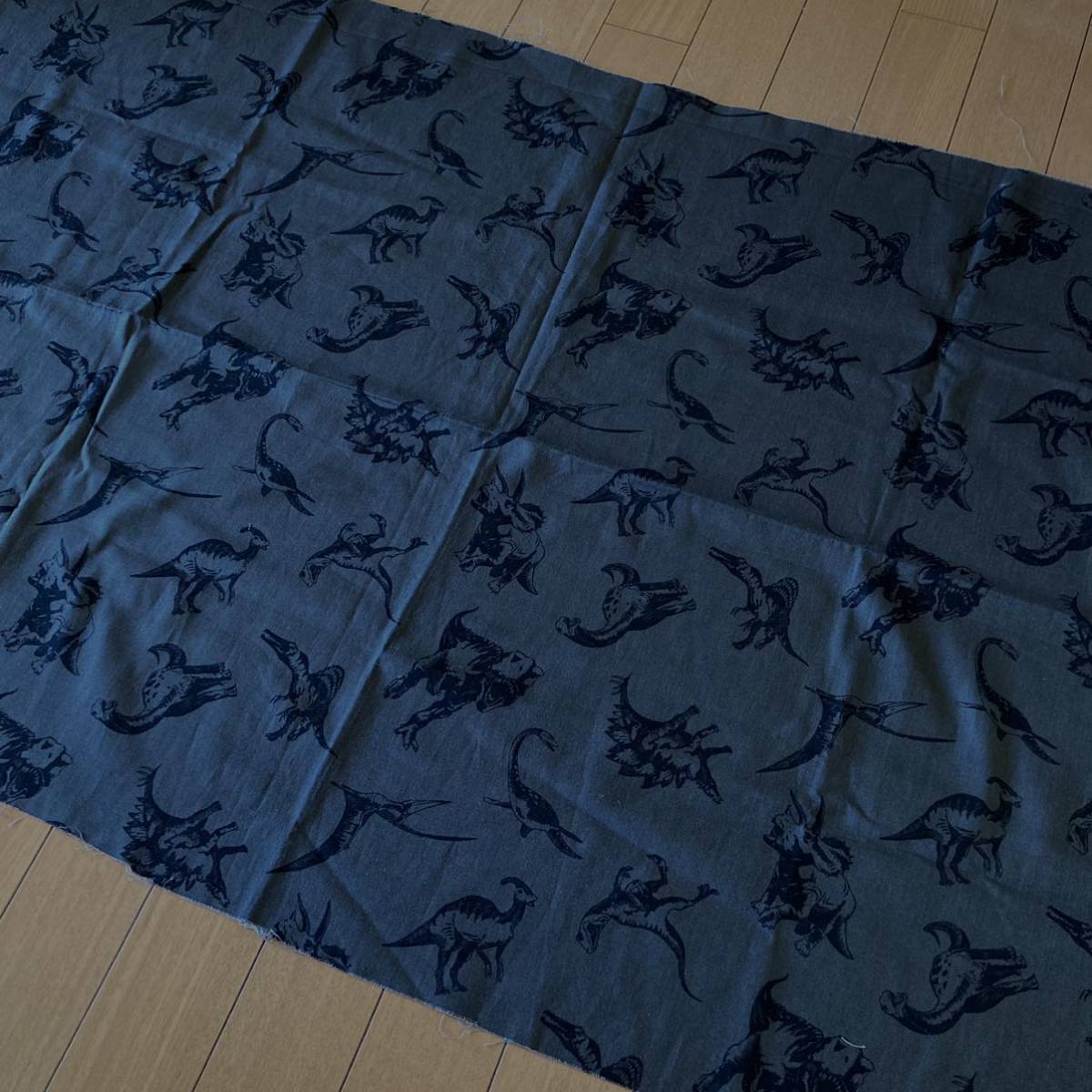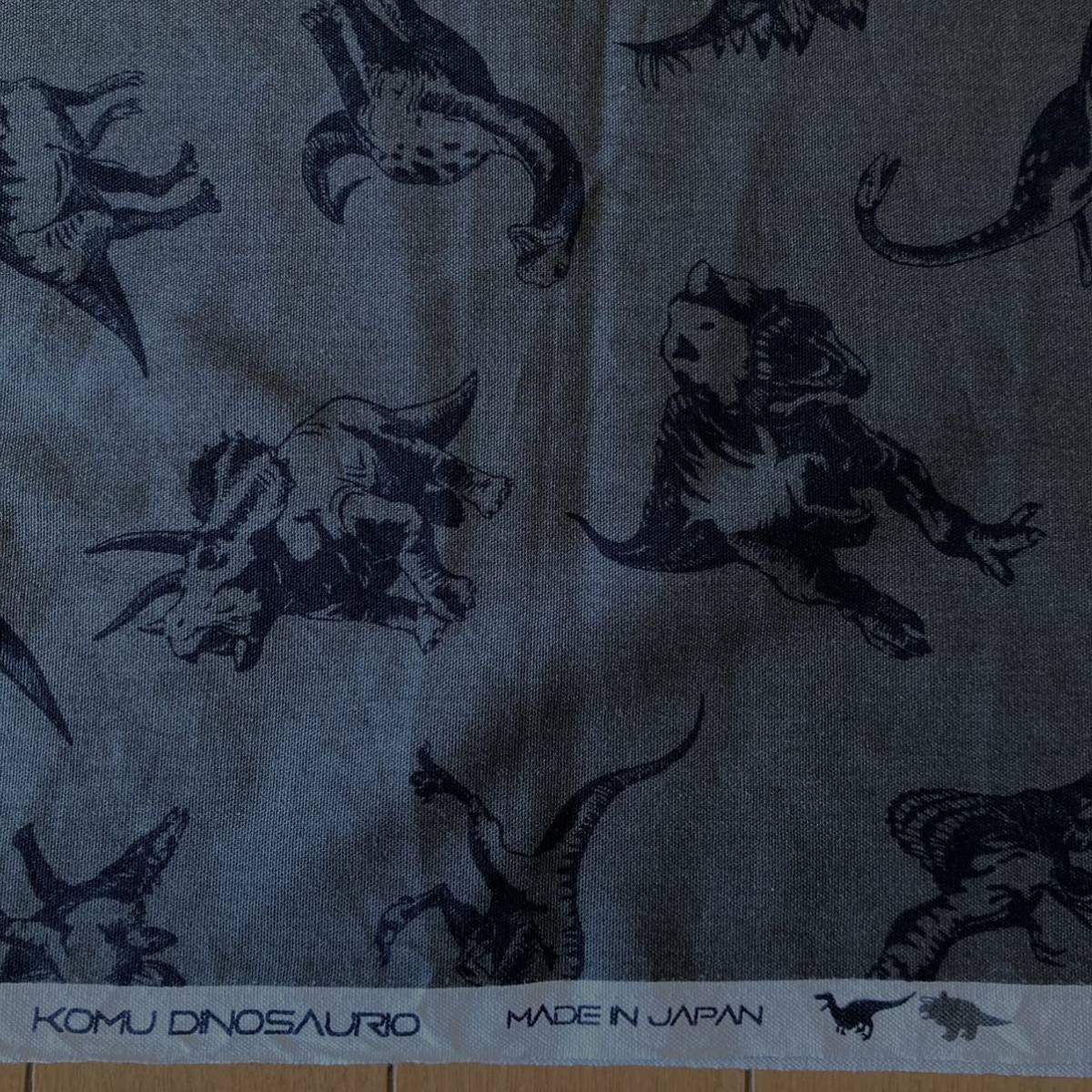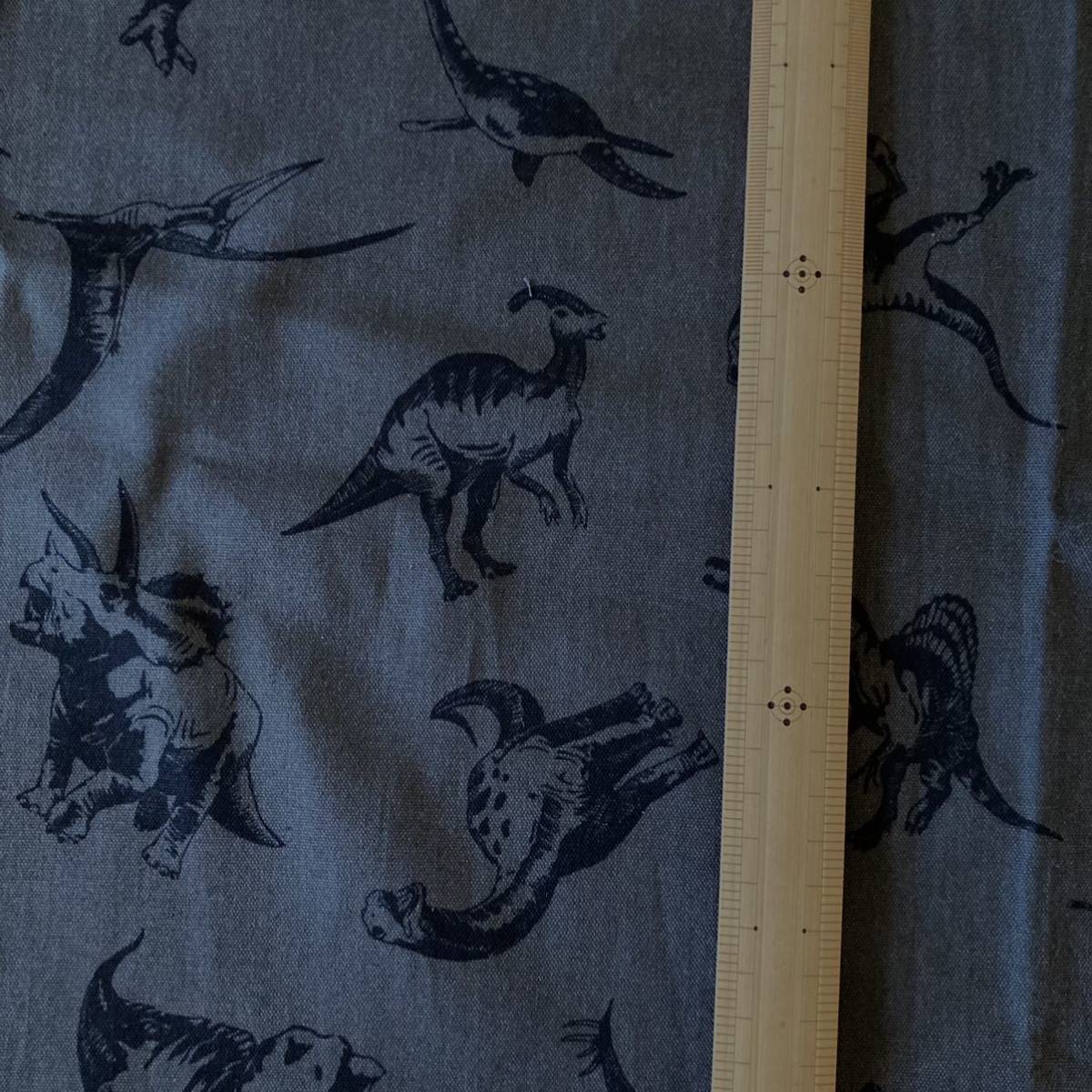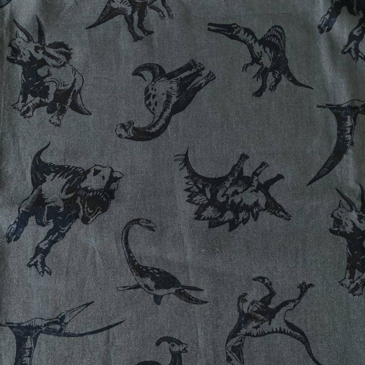 体躯の凹凸が影で浮き出た、かっこいい恐竜柄のオックスプリント生地です。手提げバッグやリュックサック、エプロンなどのハンドメイドにご活用いただけます。入園入学グッズにもおすすめです。