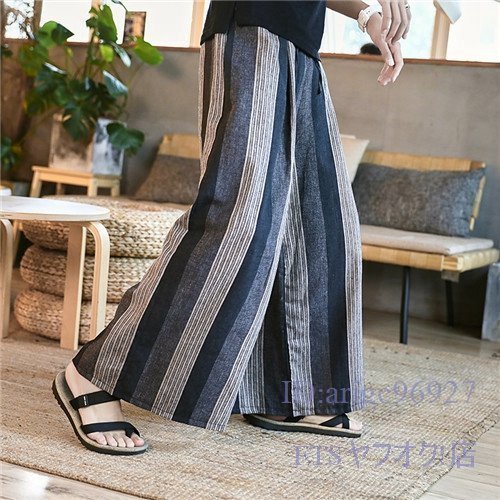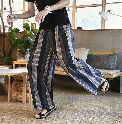 S842☆新品メンズ サルエルパンツ ワイドパンツ ストライプ 綿麻 リネンパンツ ゆったり ハロンパンツ 袴パンツ カジュアル 三色の縞 2XL