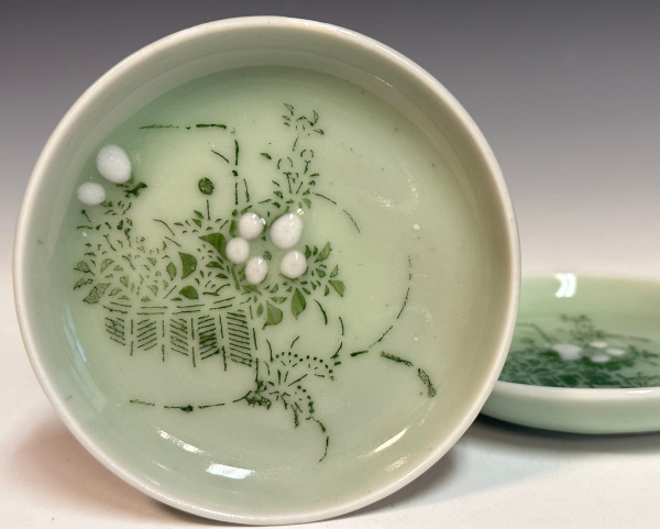 古い青磁花籠文小皿、2客セットです。瀬戸焼でしょうか。時代は明治時代頃。古いものですので、スレキズ、汚れ、フリモノ、釉切れ、くっつき、窯傷など見られます。状態の詳細は画像にてお確かめください。箱は付いておりません。お分かりの方、宜しくお願いいたします。