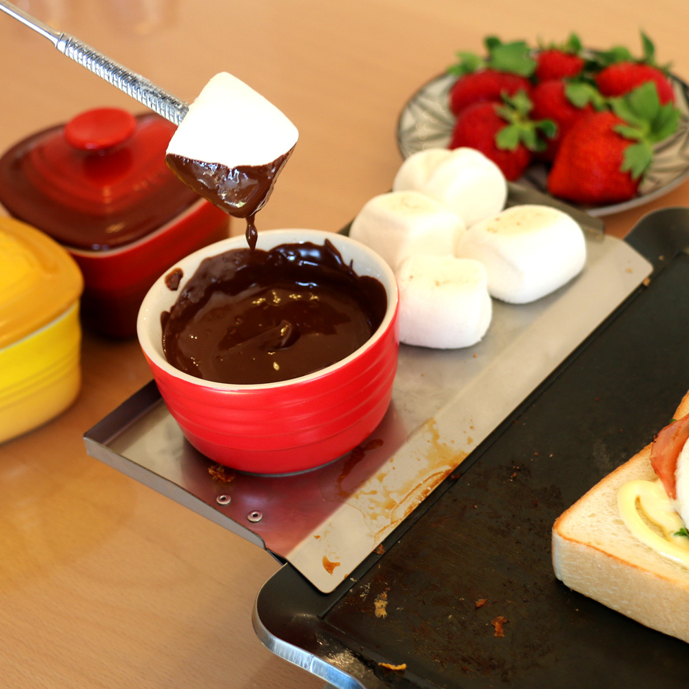 鉄板からの熱伝達で程よい保温状態を保ちますので、チーズフォンデュや、チョコフォンデュなどもお楽しみいただけます。装着することで焼面も約1.6倍のスペースとなるため、コンパクトな炙りやでもサイドトレーを装着することで人数が増えてもお使い頂けます。