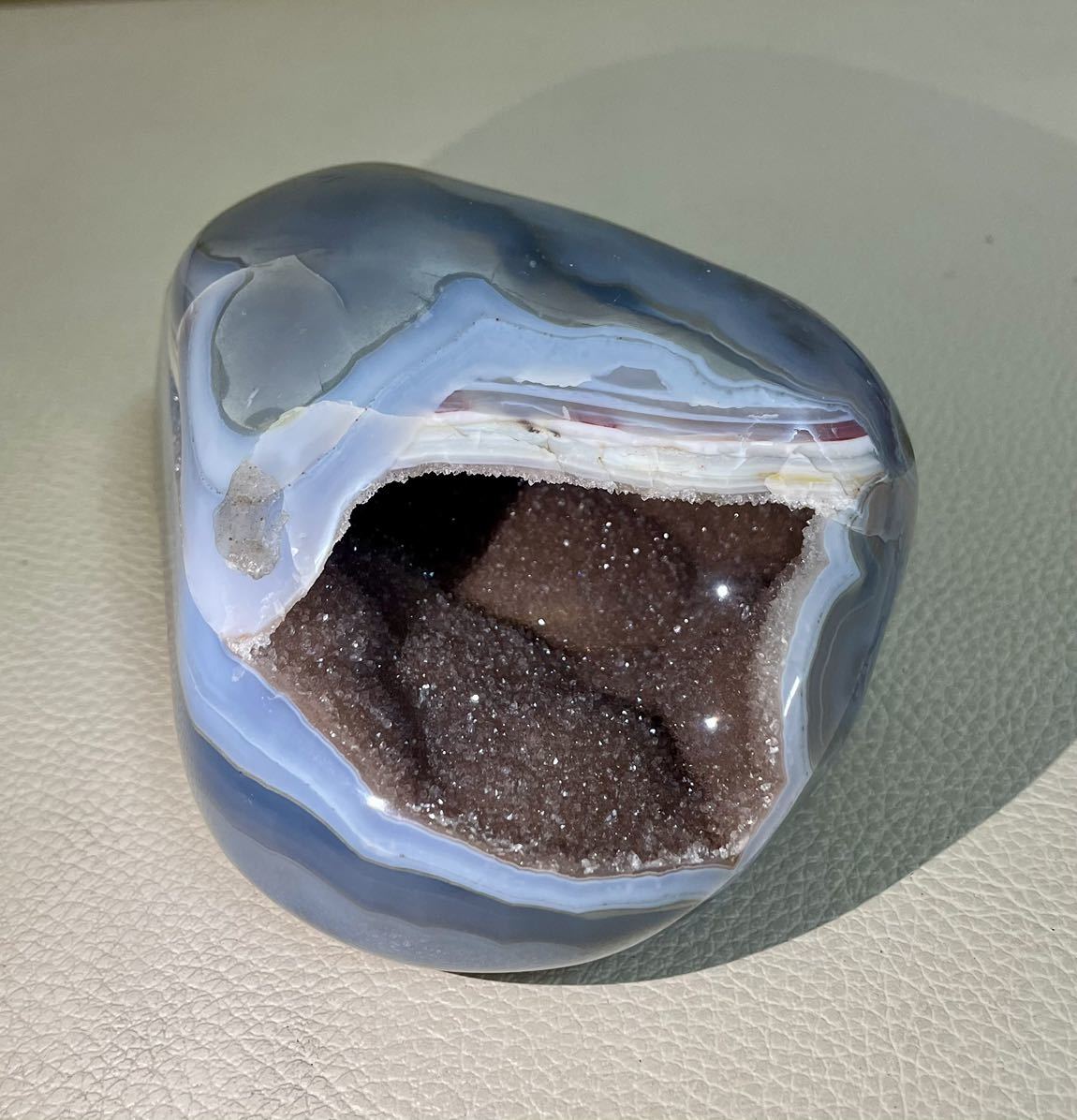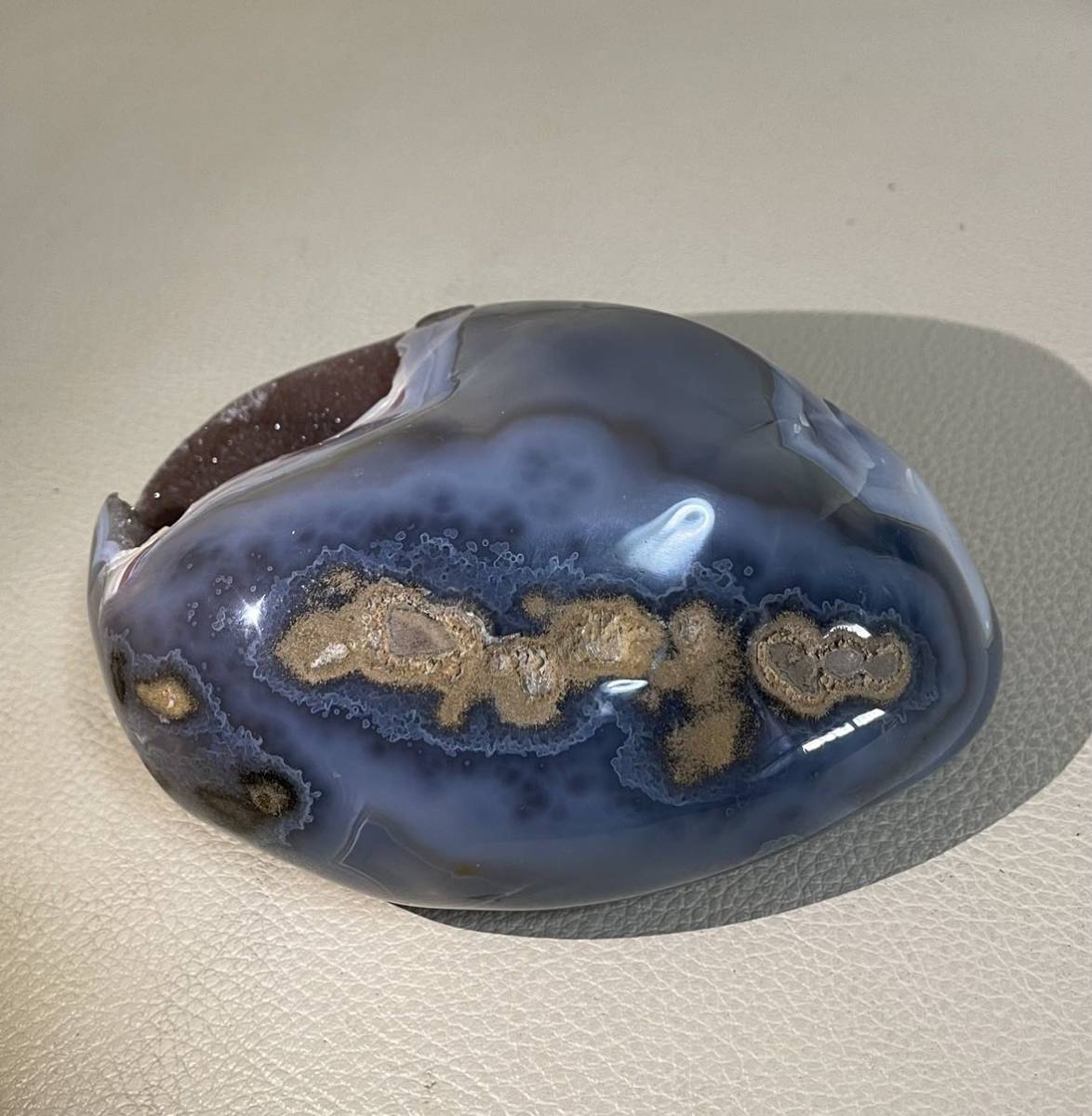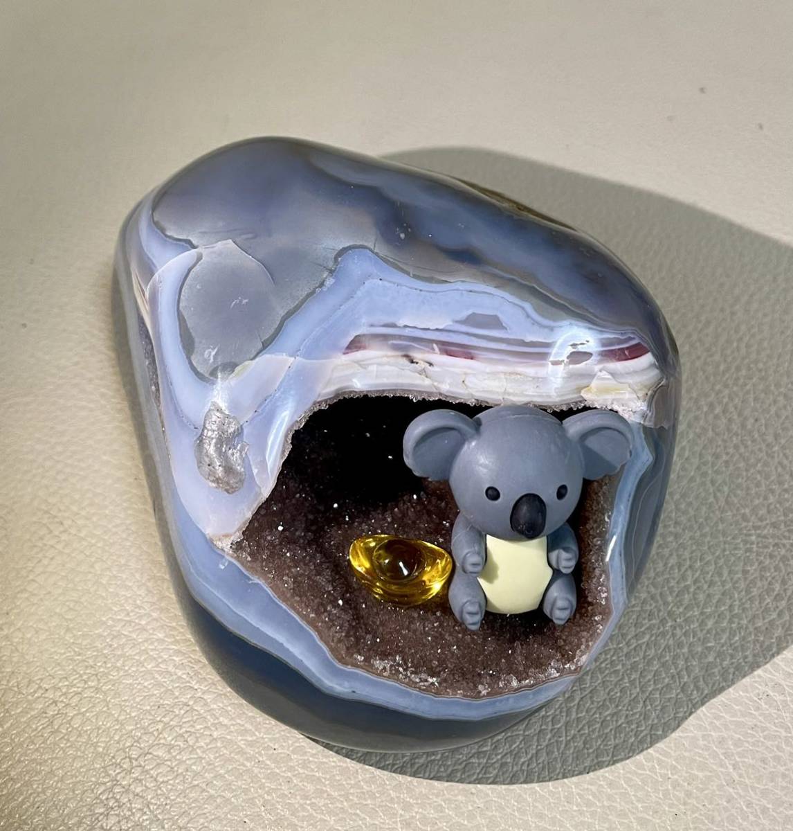 ●トレジャーメノウはメノウ(瑪瑙)原石の中が空洞化し、そこに水晶などの結晶が晶出したものです。中国で聚宝盆(ほうじゅぼん)と呼ばれています。伝説にある財宝が湧き出る鉢で、トレジャーメノウは金運や財運をもたらす縁起の良い石として古来から大切にされてきました。内部は「龍穴(りゅうけつ)」と呼ばれ、この龍穴はパワースポットを作り出すといわれています。蓋の部分が運気を呼び寄せるアンテナのように働いて龍穴に良い運気をため込み、強力な開運・財運アップの効果をもたらすとされています。またその形状から子宝に恵まれ胎児や妊婦を守ると考えられており、安産祈願のお守りとしても効果を発揮するでしょう。