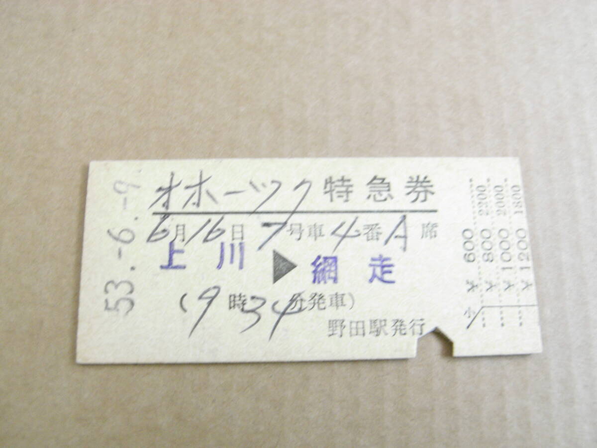 オホーツク 特急券 上川→網走 昭和53年6月9日発行 野田駅発行