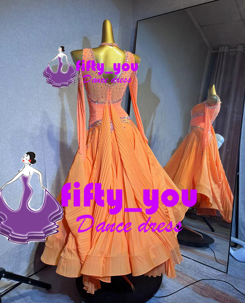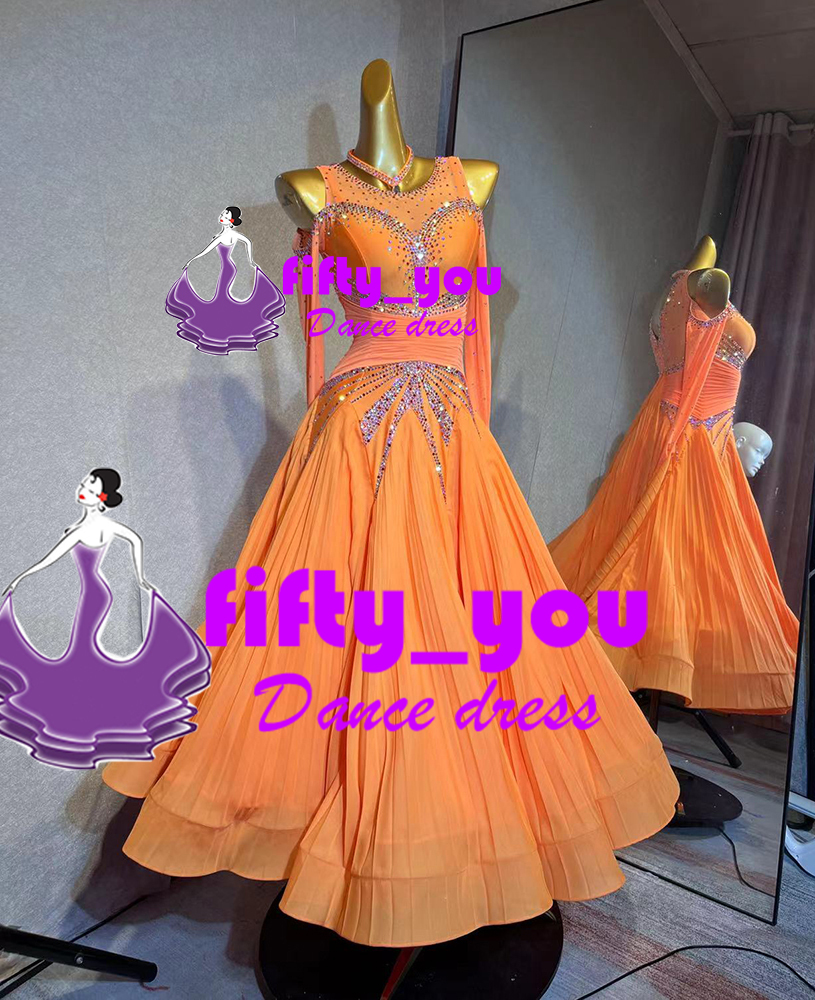新品fifty_you レディース社交ダンスドレス  魅力サイズセミオーダー 競技発表会ドレス お洒落パーティードレス プリーツ加工 オレンジ