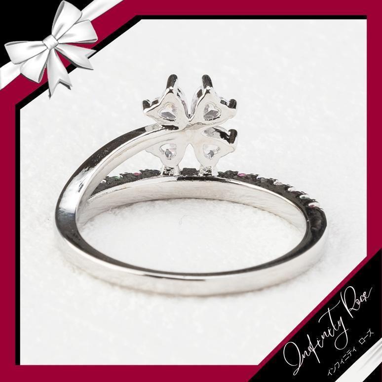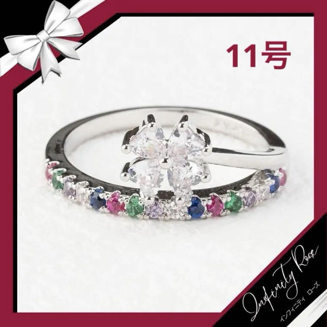 (R041S)11号 シルバーカラフル幸せの四葉のクローバーリング 爪留め指輪