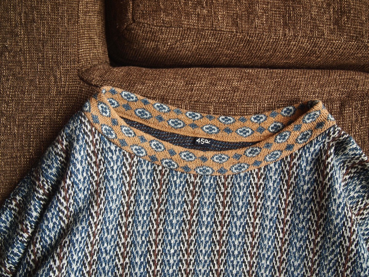 (肩の継ぎ目が幅広く取ってあるデザインなので、例えば肩幅を40cmでとると袖丈は42cm程になります。参考になさってみて下さい。また素人採寸にはなりますので、多少の誤差はご了承ください)