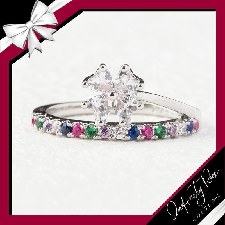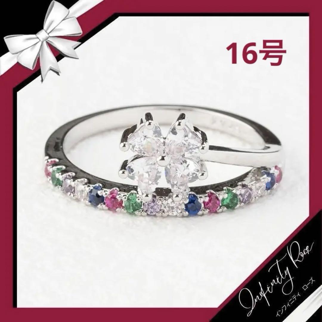 (R041S)16号 シルバーカラフル幸せの四葉のクローバーリング 爪留め指輪
