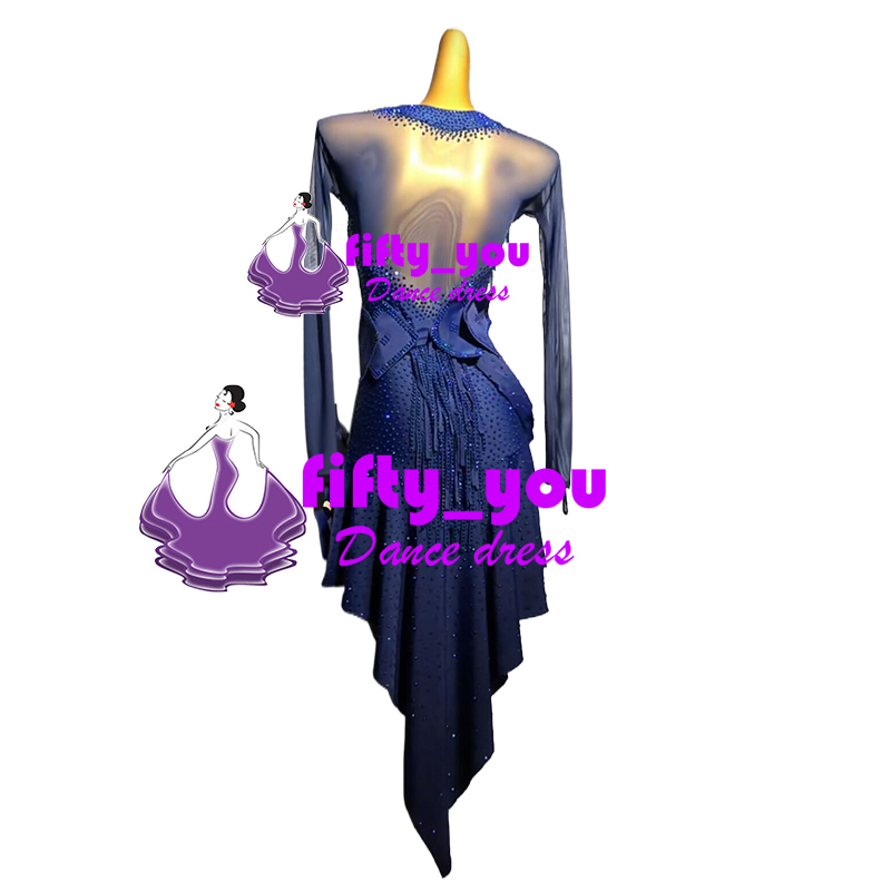 新品fifty_youレディース社交ダンス衣装 セミオーダー ライトストーン+ビーズ飾 ラテンドレス 競技用ドレス 高級衣装 ネイビー