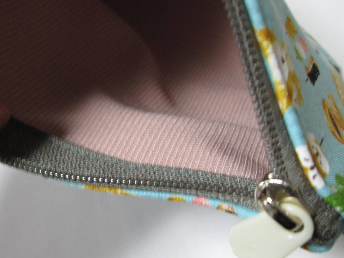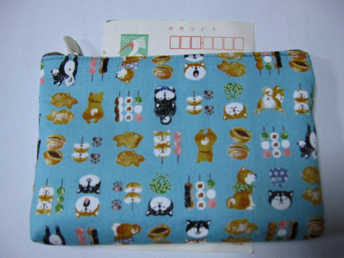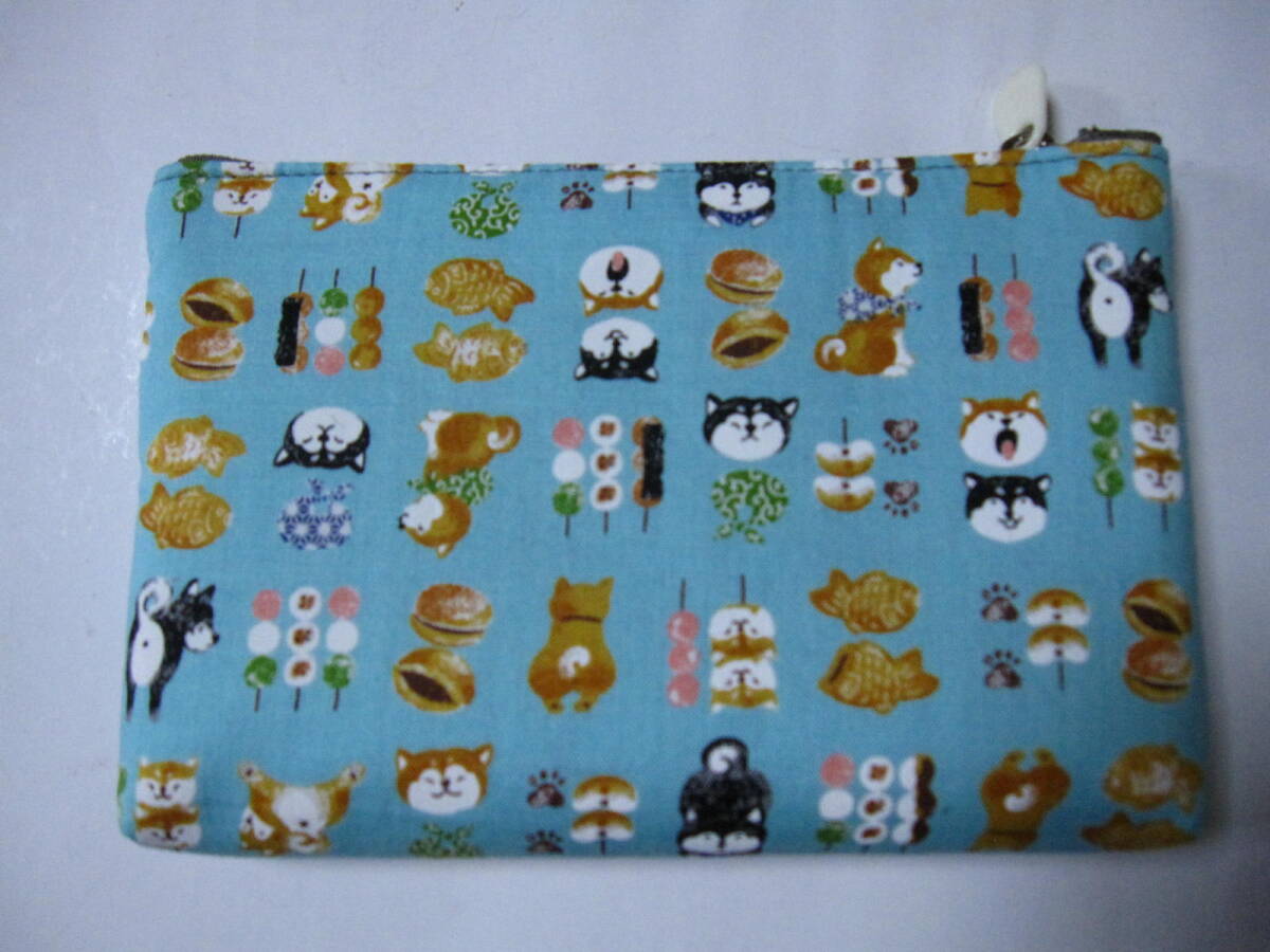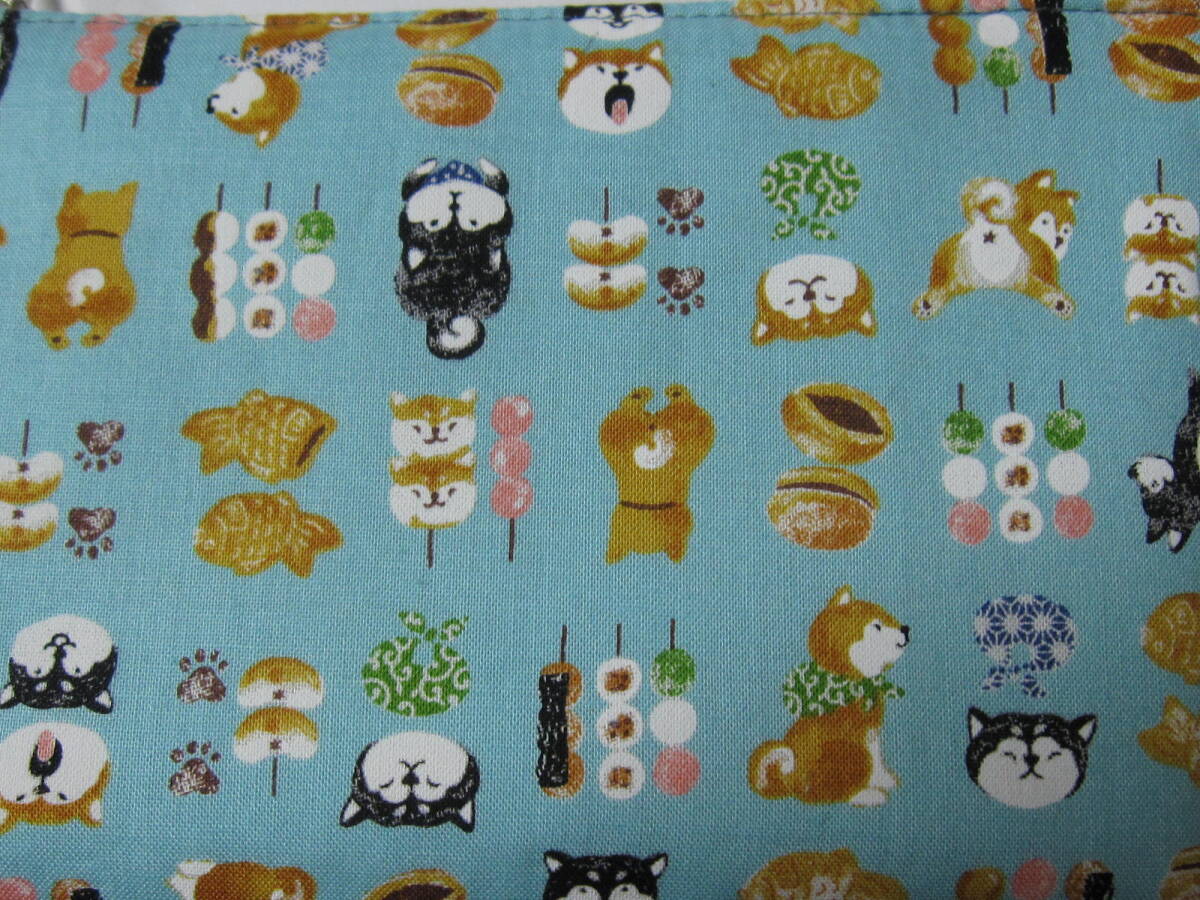 ★ ハンドメイド  幅広・大きめ・ポーチ  愛らしい柴犬と美味しそうな和菓子のコラボ  (ライトブルー)  ※1点のみ。