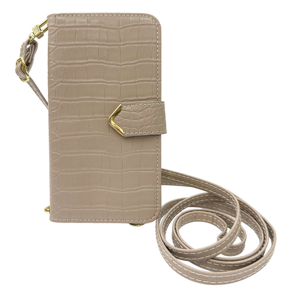 OPPO A54 5G 対応 スマホショルダー 手帳型 ケース (グレージュ) myones 斜めがけ ストラップ 付き クロコ柄 型押し ワニ革調 スタンド機能 落下防止 カード収納 ニュアンスカラー くすみカラー PUレザー
