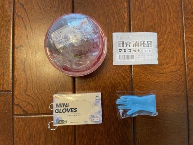 J.DREAMから発売の「研究消耗品マスコット」全5種のうち「使い捨て手袋(青)」になります。医療衛生品を忠実に再現した大変面白い品です。画像左のカプセル入りが提供品で、それ以外は私物(開封品)でサンプルです。手袋フィギュア3枚入りです。カプセル入り、内袋未開封、リスト付きになります。