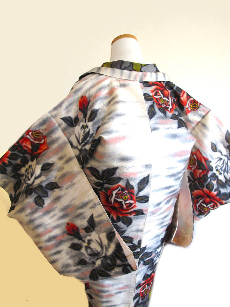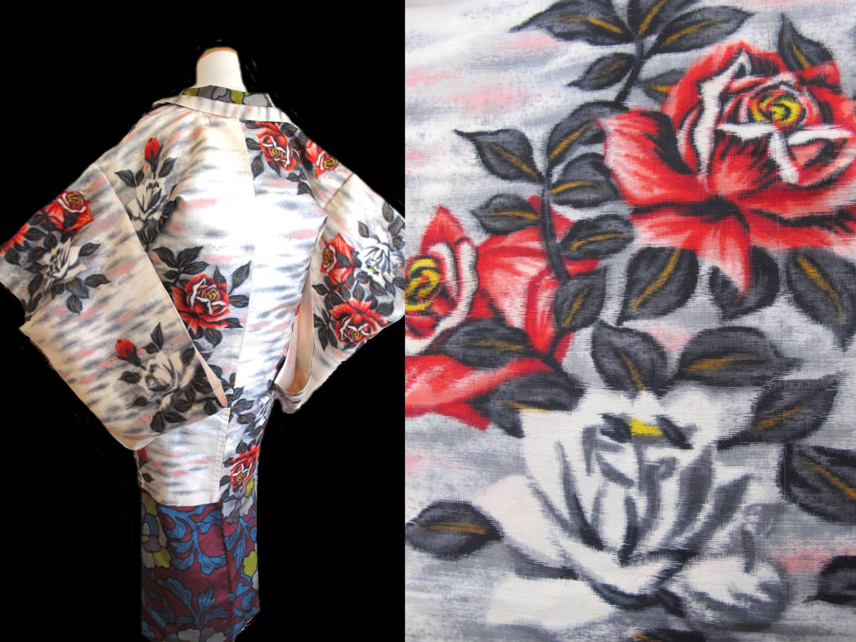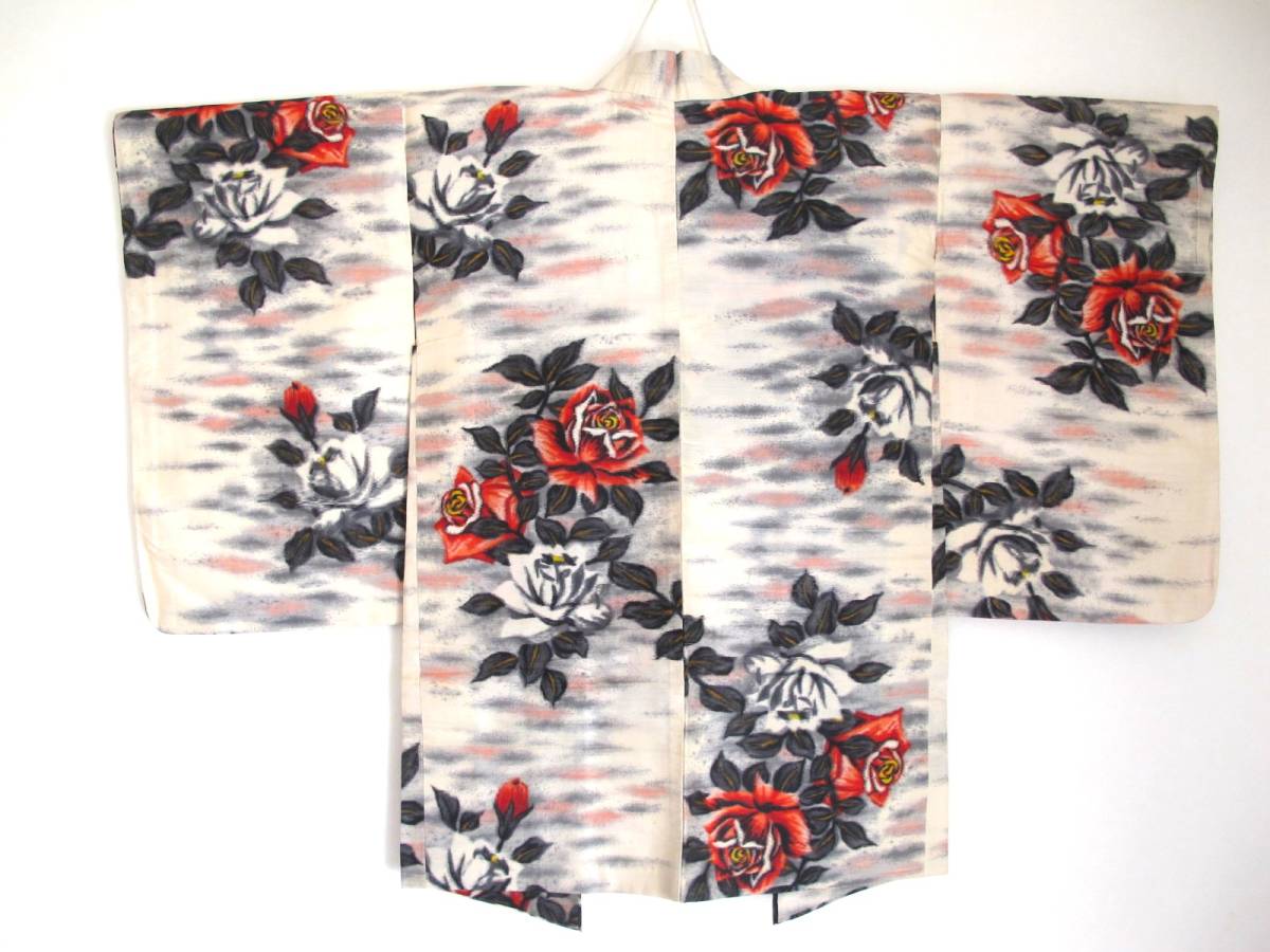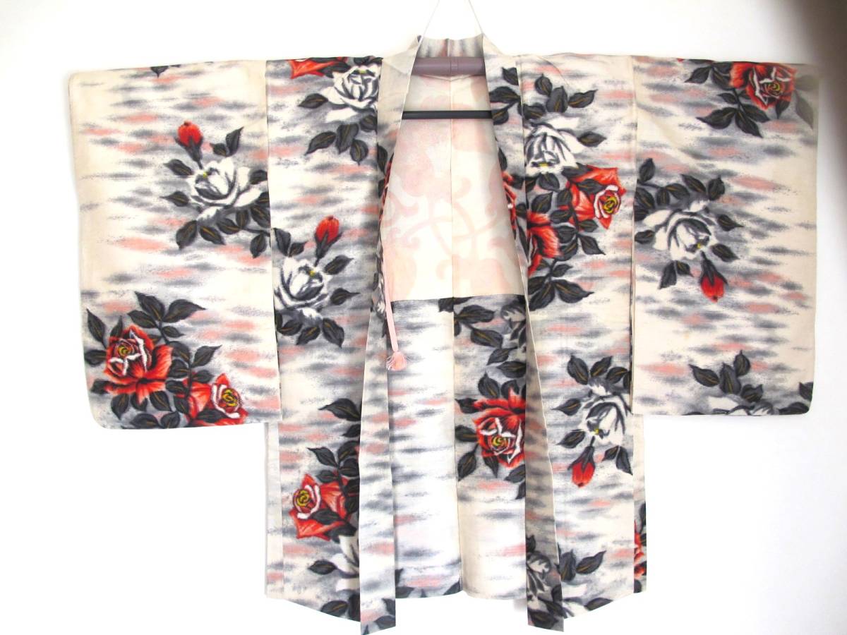 赤白の薔薇に霞がかった、どこか物憂げな魅力があるアンティーク銘仙羽織です。 高畠華宵の描くアンニュイな絵を思い起こさせます。 |