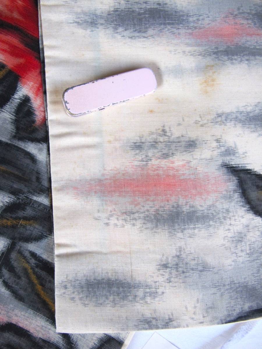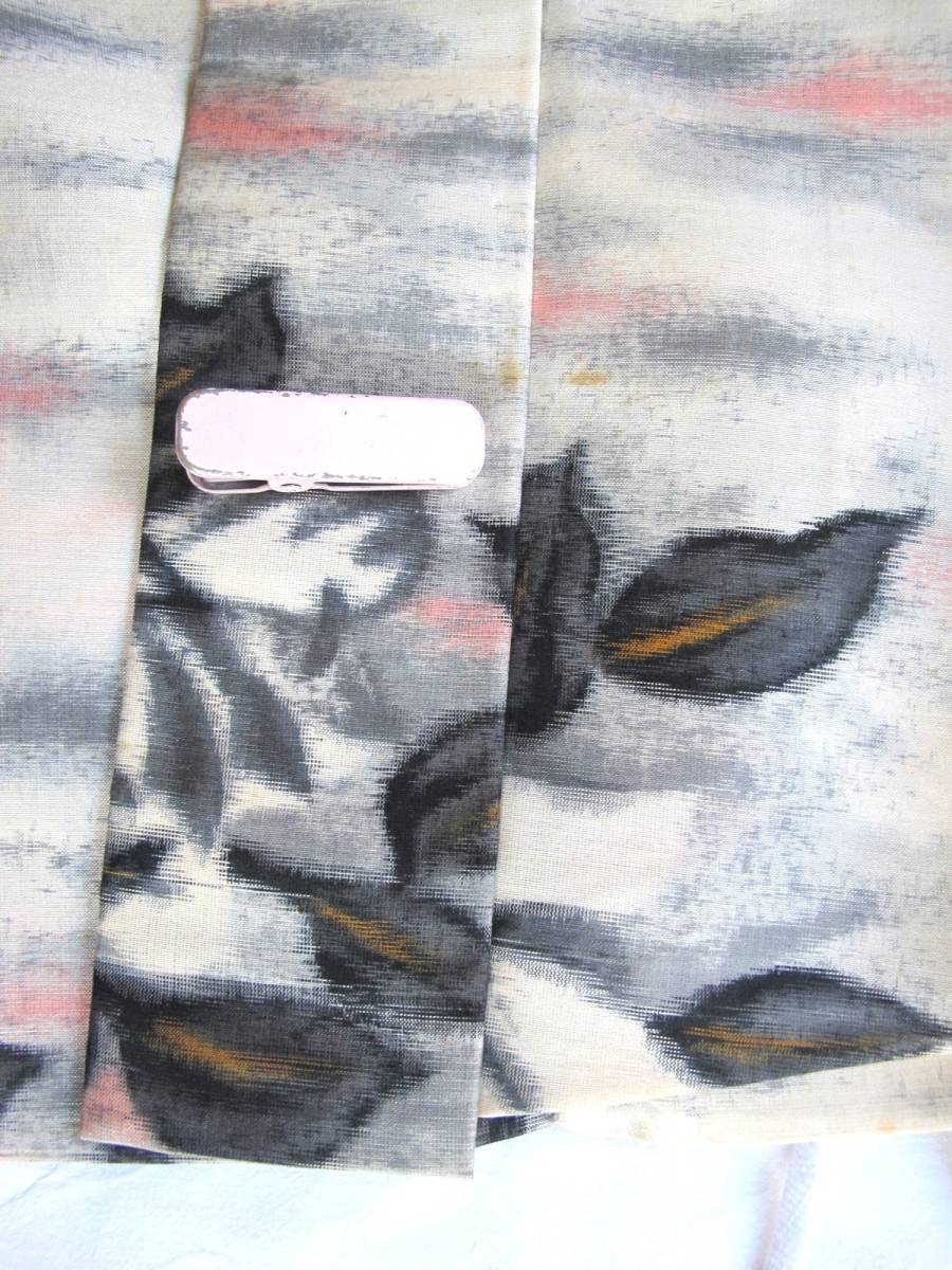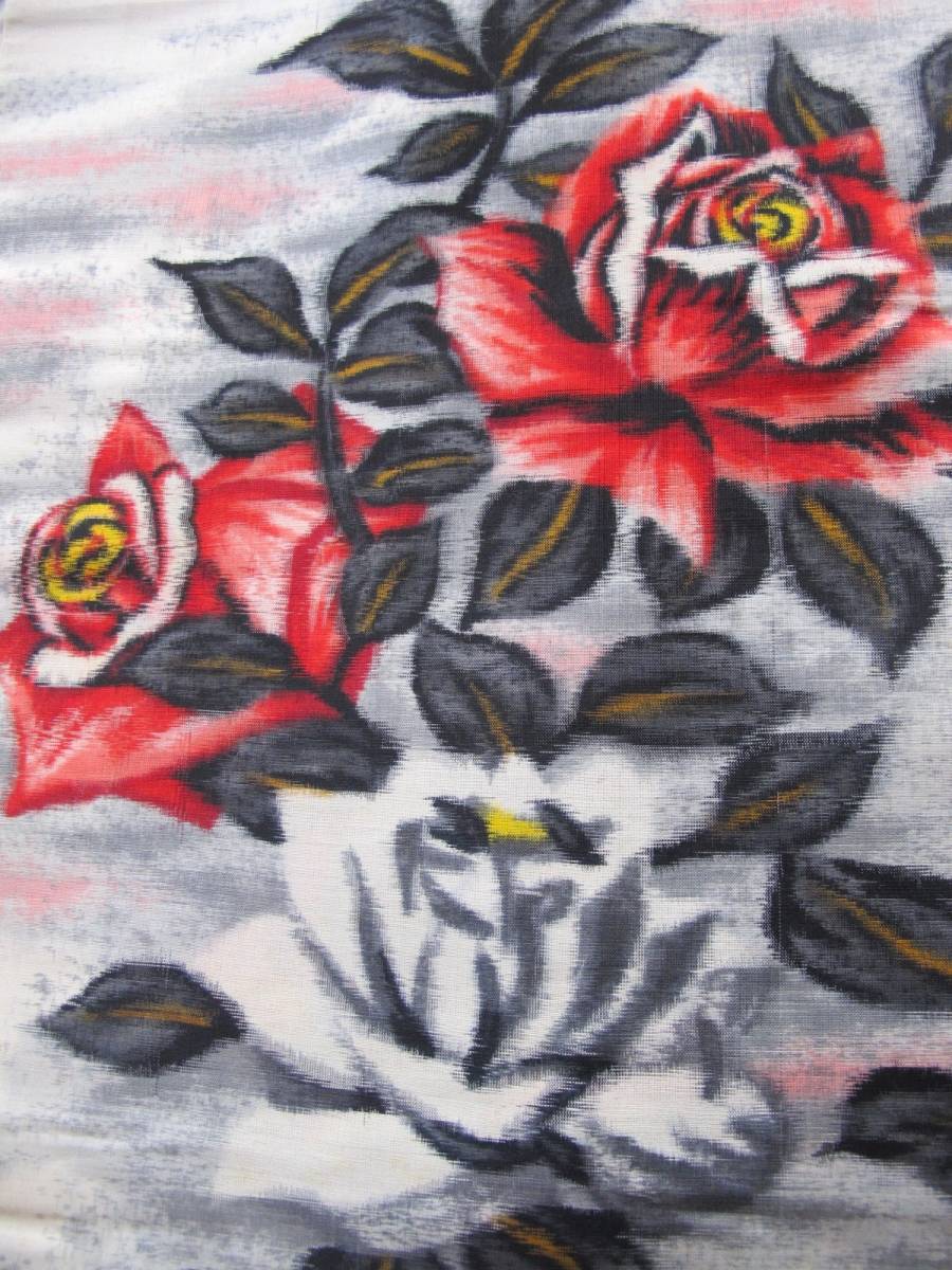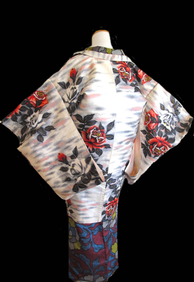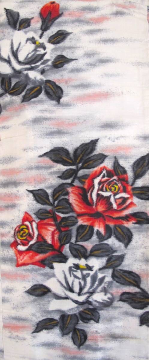 赤白の薔薇に霞がかった、どこか物憂げな魅力があるアンティーク銘仙羽織です。 高畠華宵の描くアンニュイな絵を思い起こさせます。 |