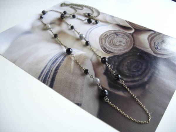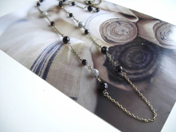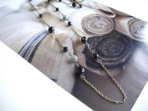 セシル・スタイル・・シリーズです♪恋する人・・シックなオニキスとラブラドライトのネックレスです♪漆黒のオニキスに神秘的なラブラドライトの丸カットを合わせてロマンチックな表情です♪6ミリ、8ミリのラウンドカットのオニキスには8ミリのラブラドライトを合わせました♪長さは90センチ+アジャスター12センチで最長102センチ位です♪2連にされても素敵です♪お揃いのネックレスやブレスレットも出品しています♪シンプルで飽きのこないいつまでも着けられるデザインを考えて作りました♪ハンドメイドをご理解頂いてノークレーム、ノーリターンでお願いします