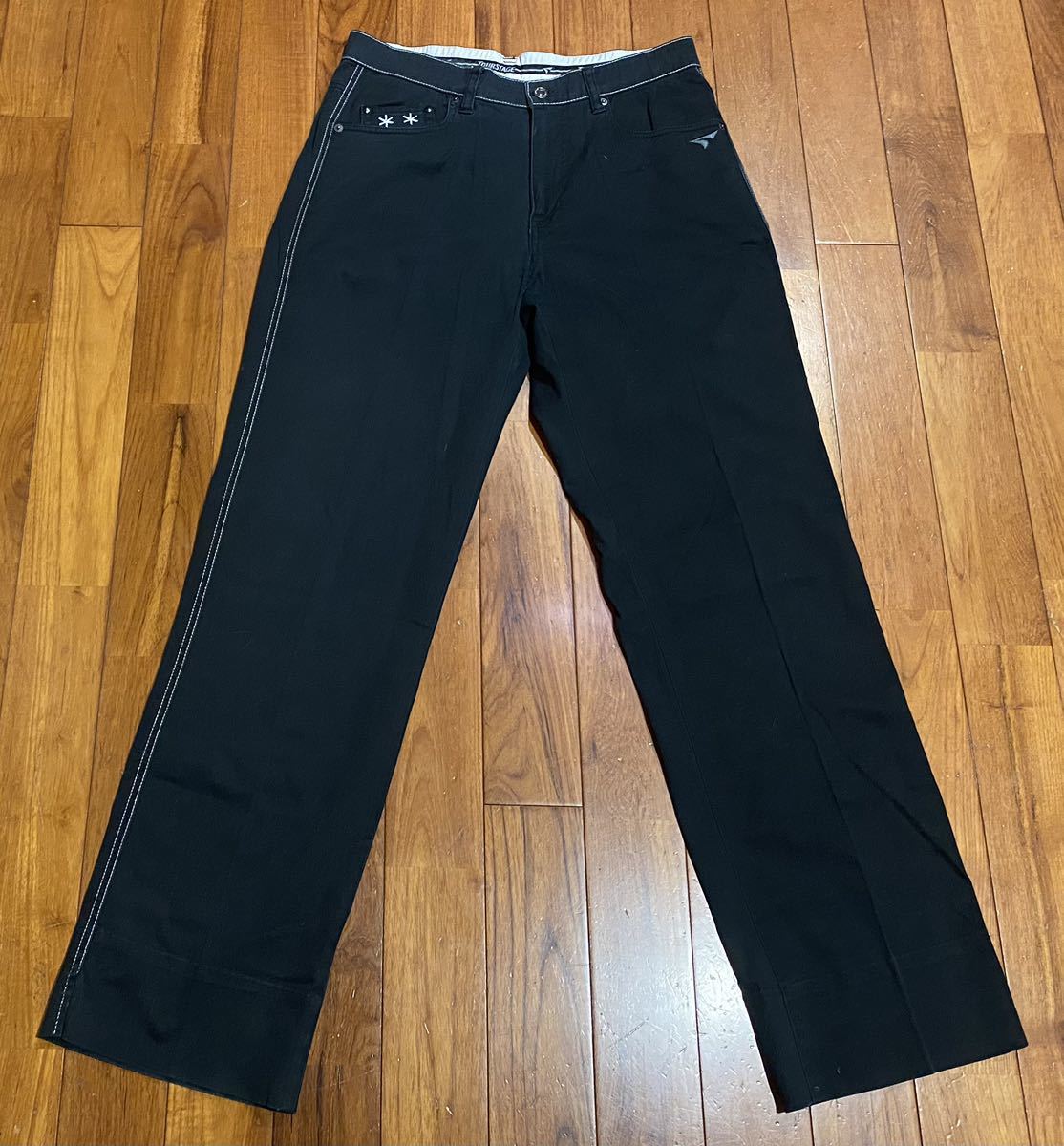 ツアーステージのストレッチゴルフパンツ、MC-RTM52Kです。色はブラックです。USEDですが状態は良いです(10段階中8程度)。生地はストレッチ入りで綿97%、ポリウレタン3%です。ジッパーフライです。正規品です(ブリヂストンスポーツ(株)、中国製)。サイズはウエスト79cmでウエストは重ねずに平置きで約80cm、ヒップ約105cm、股上約28cm、股下約82cm、股下15cmのふともも部分約59cm、裾まわり約46cm、重量約510gです。発送はゆうパケットポストになります。
