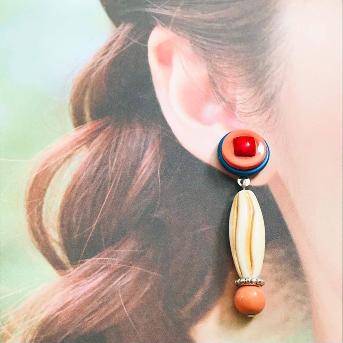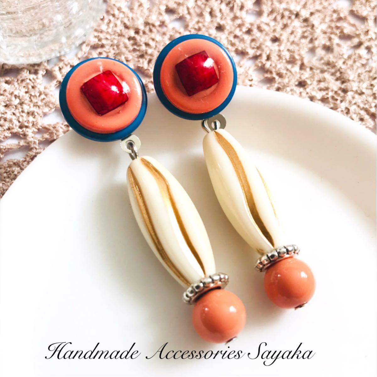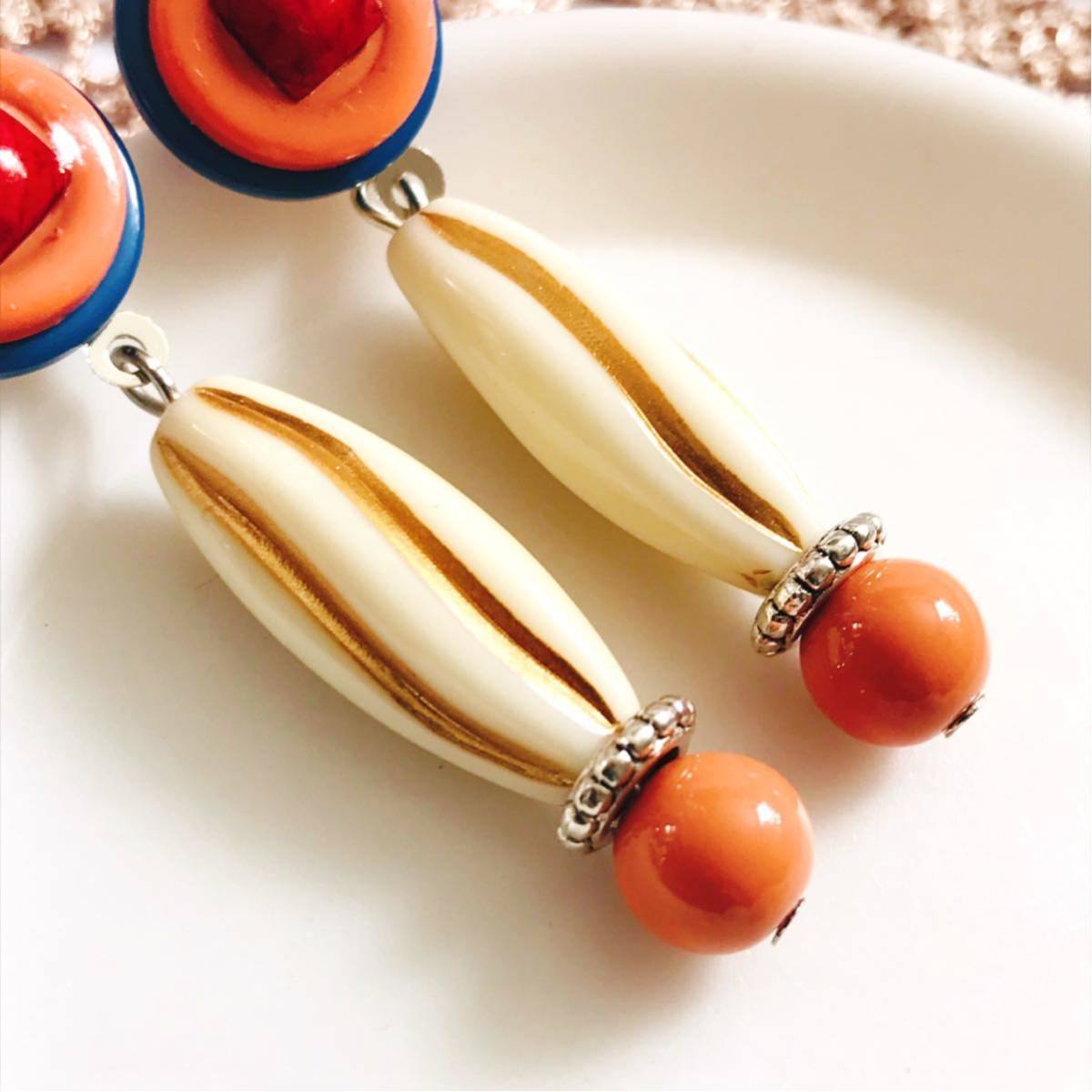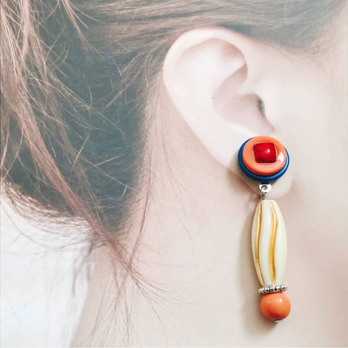 新品即決◆ハンドメイド スタッドピアス ボタン アクセサリー レトロポップ ブルー オレンジ 手作り ゆらゆら