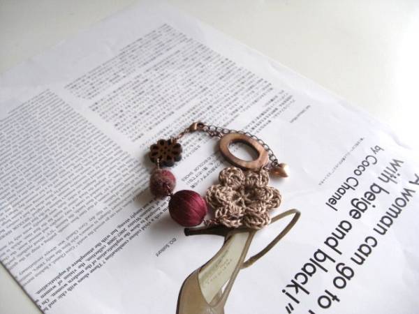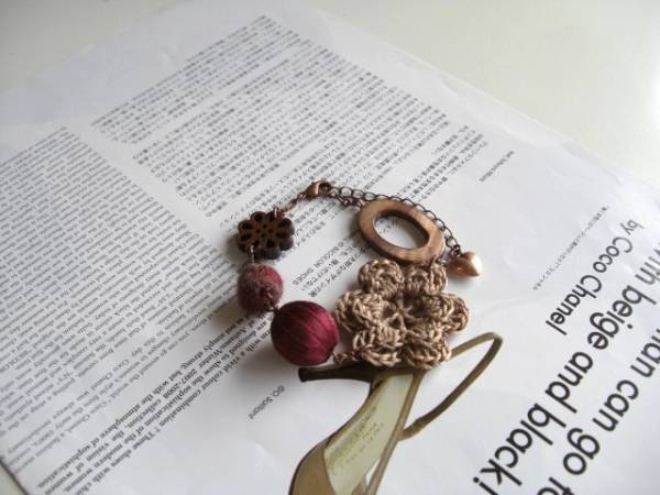 女の子らしさを+して・・シリーズです♪秋色の異素材・・シックな秋色のボルドーや煉瓦色やブラウンのフェルト玉やシェルリングやウッドのお花、編みフラワーを集めてロマンチックなブレスレットです♪12ミリから37ミリ位までの大きさ違い、デザイン違いの異素材がアンティークな表情です♪長さは17センチ+アジャスター6センチで最長23センチ位です♪お揃いのネックレスも出品しています♪ハンドメイドをご理解頂いてノークレーム、ノーリターンでお願いします