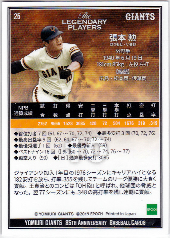 EPOCH 2019 読売ジャイアンツ/巨人 創設85周年記念ベースボールカード The Legendary Players レギュラーカード No.25 張本勲 野球カード