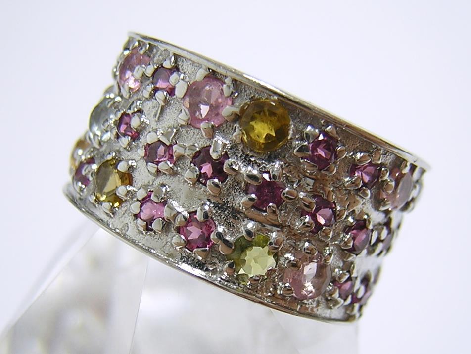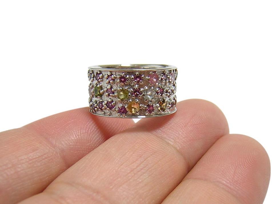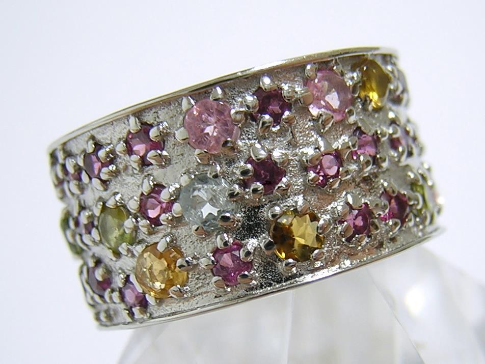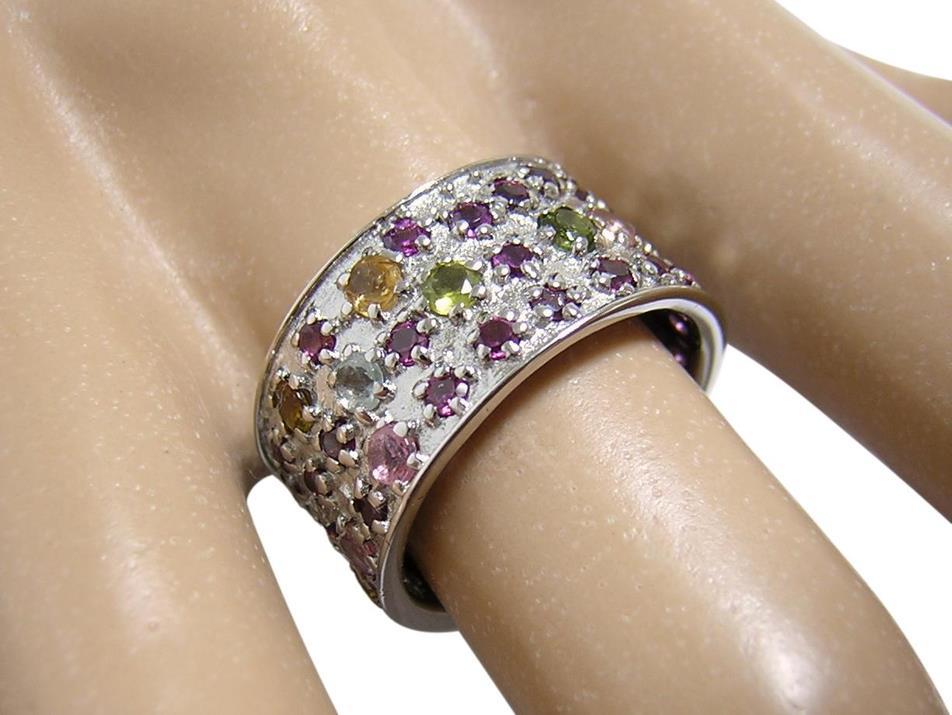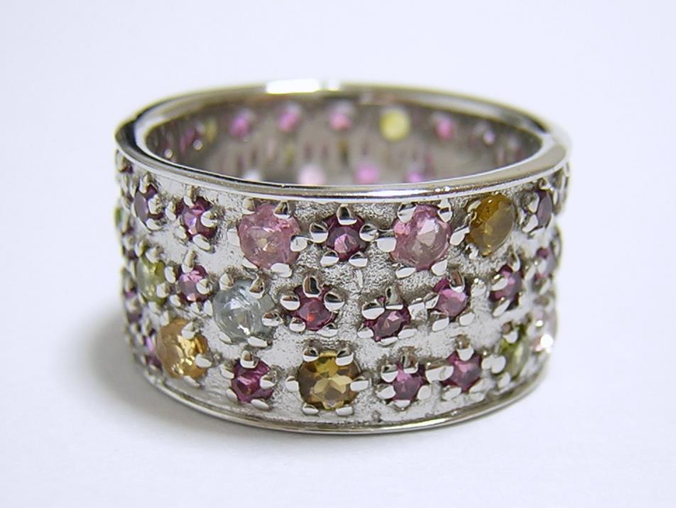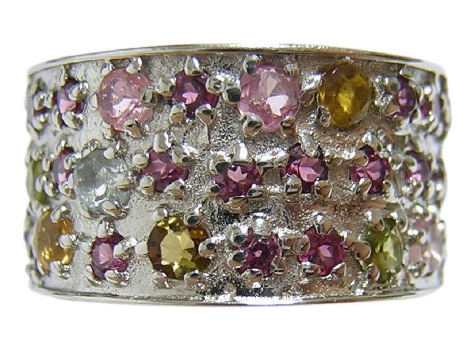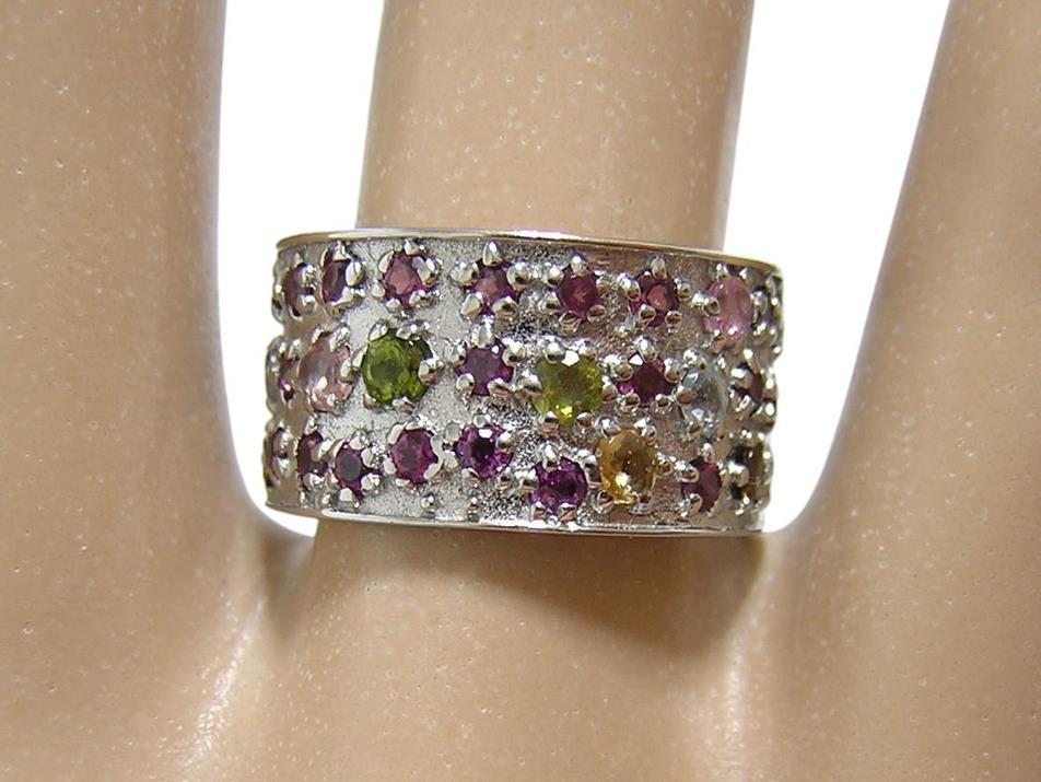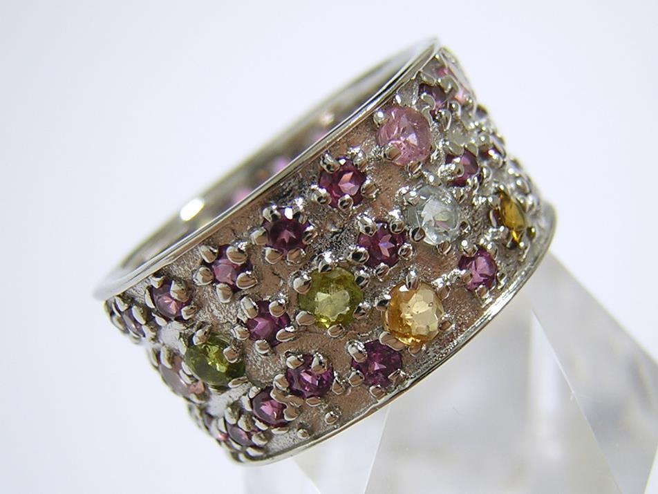天然マルチカラートルマリンを使用したデザインリングです。 【石名】天然マルチカラートルマリン 【産地】ブラジル産 【処理】非加熱 【カット】ラウンドファセットカット 【重さ】5.7g 【サイズ】13号 (お直しは承れません) デザイン部:縦10mm×横20mm 【素材】シルバー925 (14金ホワイトゴールド仕上げ) 【刻印】925 【状態】新品 |