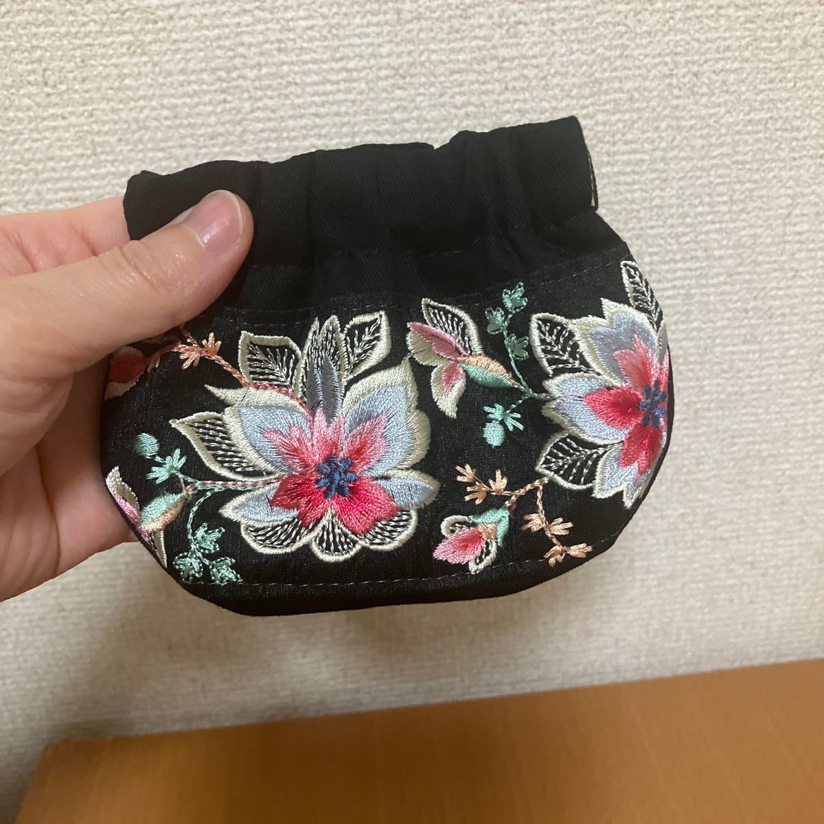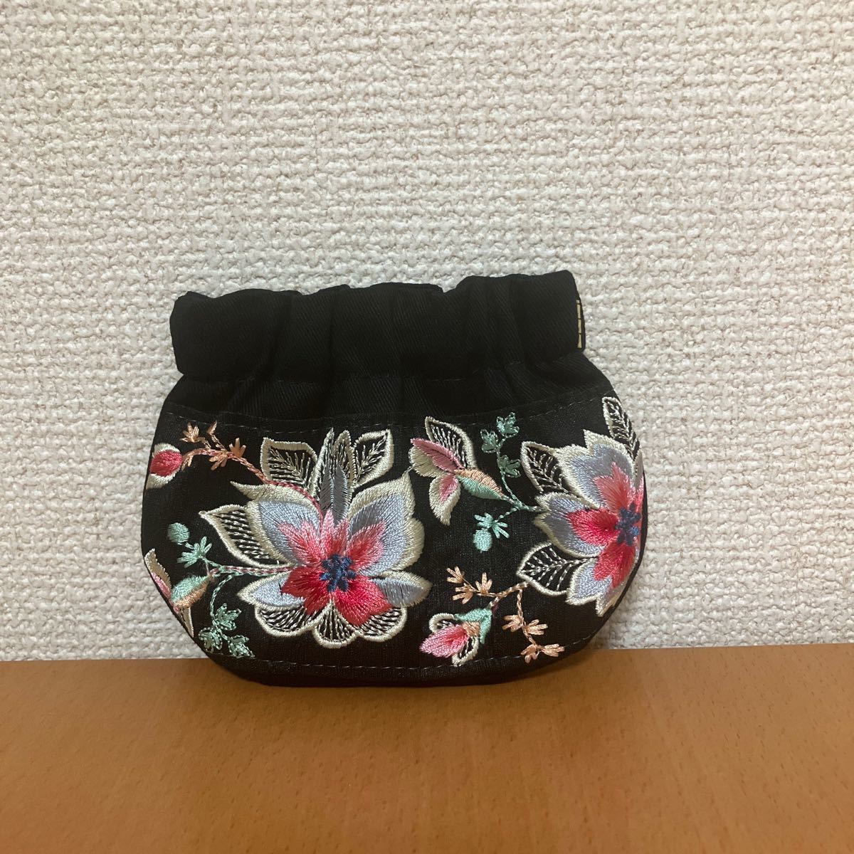 10センチのバネ口金を使用し、片面にインド刺繍リボンを付けて小さいポーチを作りました。接着芯は貼っておりません。小物入れなどにいかがでしょうか。インド刺繍リボンは繊細な作りのため、糸が出たりほつれたりする可能性があります。スパンコールが付いている物は引っかりにご注意ください。