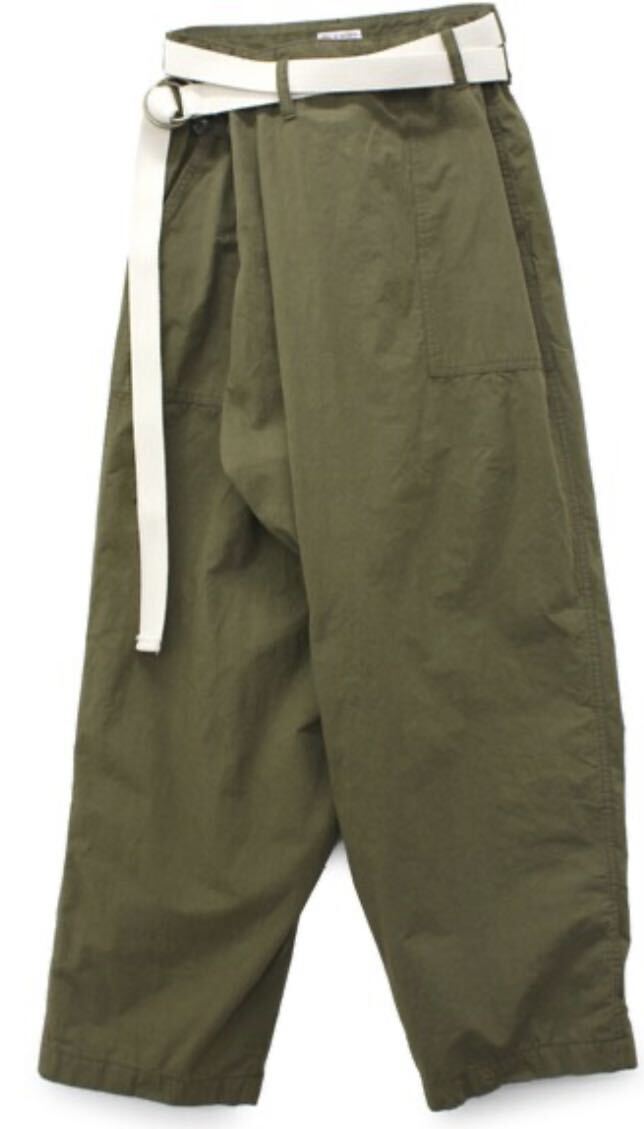左右非対称になるパンツなので、付属のベルトをぎゅっと絞ってボリュームの違いを強調させた着こなしがおすすめ。