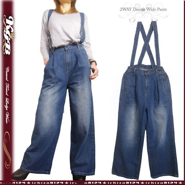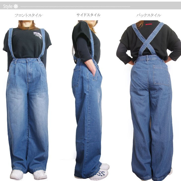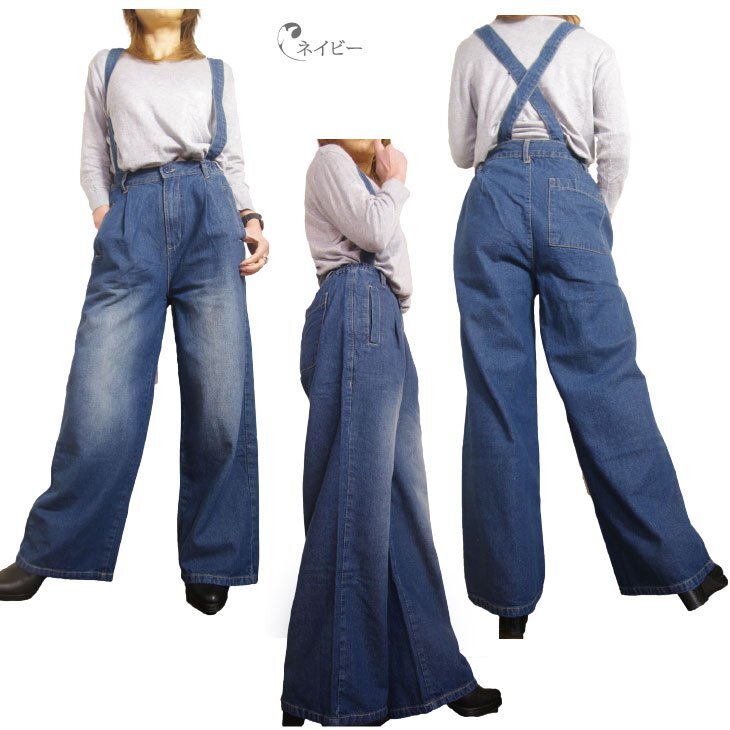 L ワイドパンツ デニム レディース サスペンダー ゆるシルエット ボトム ネイビー 新品