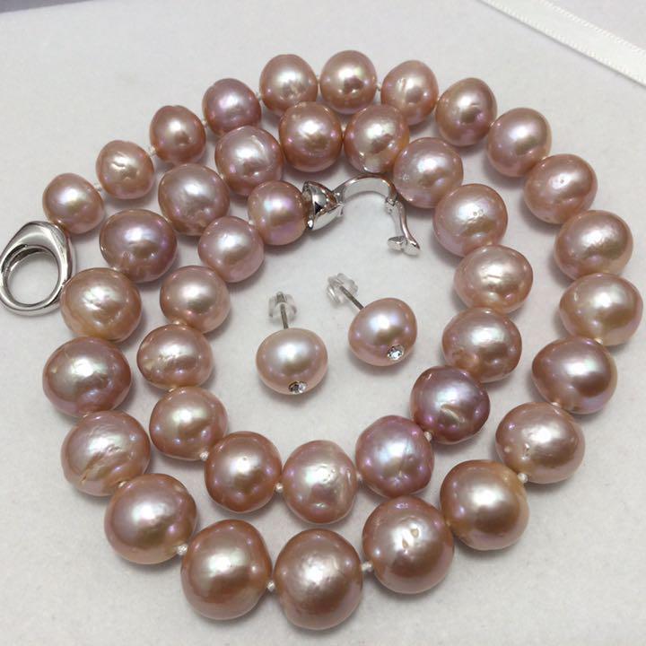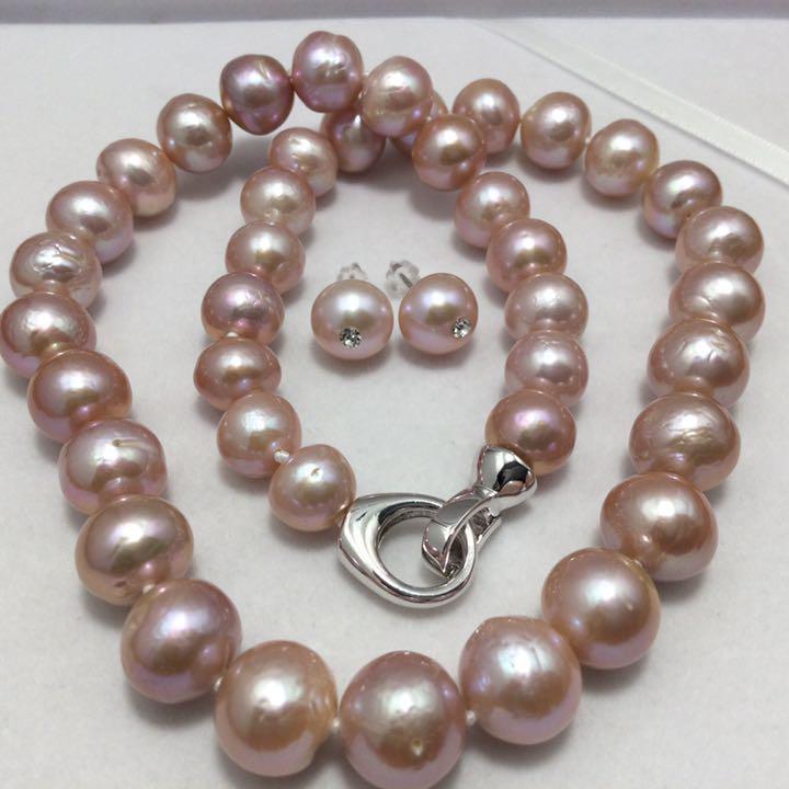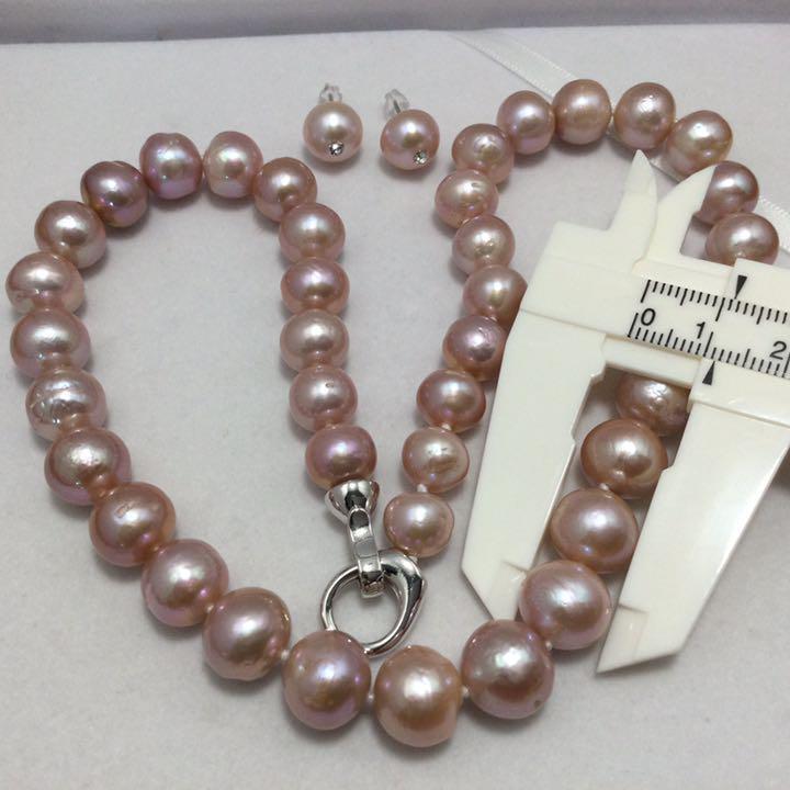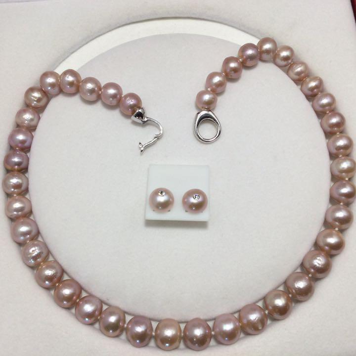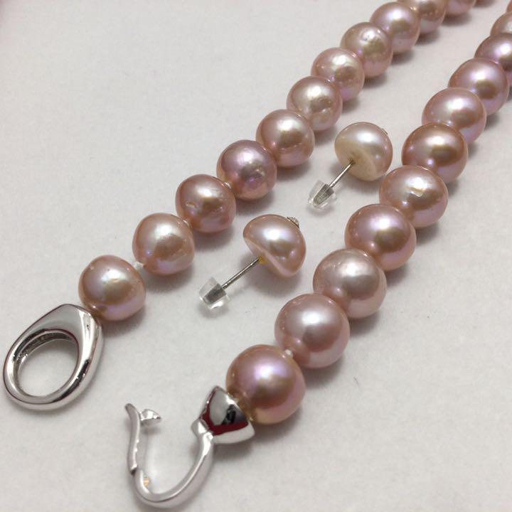 真珠ネックレス+飾りピーズ付きピアスセット本物特大珠9-11mm人気柄パープル系ピンク【訳あり品特別価格処分】