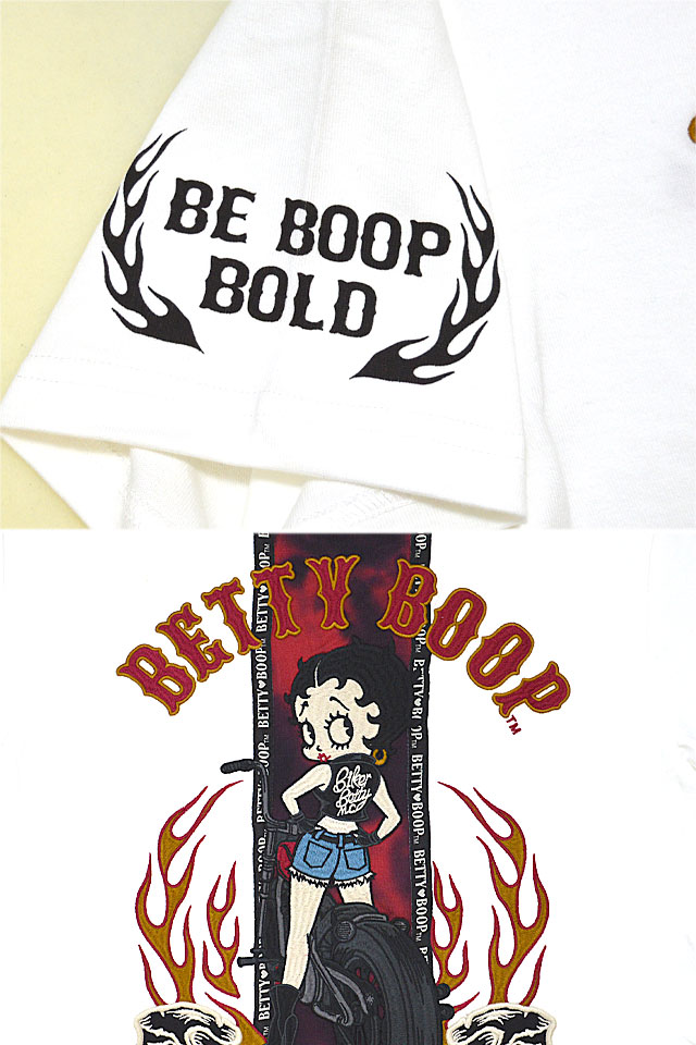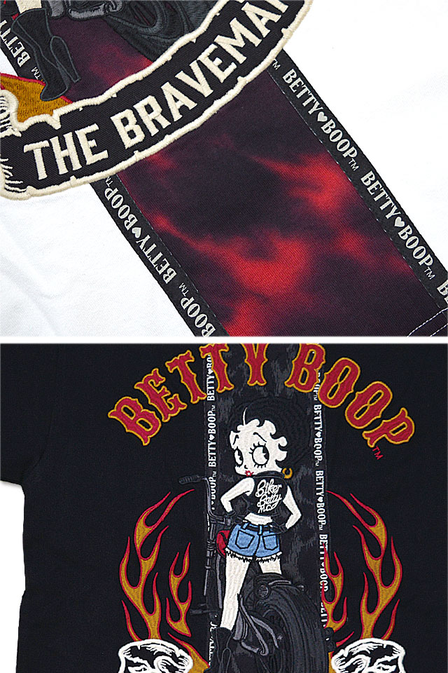 1920年代~40年代にアメリカでワークウェアを中心とした製品を世に送り出したブランド「The BRAVE-MAN」から「BR×BETTYコラボ 天竺半袖Tシャツ(BBB-2414)」のご紹介です。 大きな瞳とぽってりした赤い唇が印象的な女の子、ベティ・ブープ(Betty Boop)。 背中には愛車に跨るベティの姿が刺繍で描かれています。 バイクに合わせたクールなコーディネートも魅力のひとつ。 絵柄上下のロゴは刺繍。 縦には別生地が切り替えられており、ロゴ入りのテープで縁取られています。 フロントはシンプルに、左胸にロゴとベティのアイコンを刺繍で配しました。 左袖にはロゴをワンポイントでプリントしています。 ボディーには、ややしっかりとした刺繍に負けない強さを持ったTシャツ生地を採用。 | |||||||||||||||||||||||||