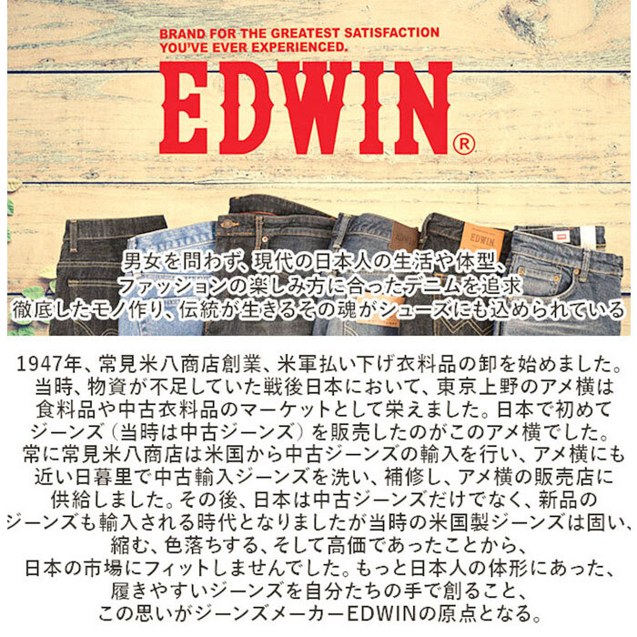 | 商品説明 | ・・・「ストレッチ素材×軽量設計」で、着用時のストレスフリー。日本発のNo.1デニムブランド「EDWIN」から、「メンズ 軽量ローカットスニーカー」が新登場。 ・【ふわっと軽快な履き心地】 ・片足約180gの軽量設計。履いていることを忘れてしまうほどの軽い履き心地で、軽快なフットワークを実現。(※26cmサイズの商品、片足分の重量です。) ・【幅広WIDE設計】 ・甲幅が広めの方でもゆったり履ける!つま先部分に締め付け感のない「幅広4Eワイド設計」。 ・【伸び~るストレッチ素材】 ・足の甲に当たるアッパー部分に、柔らかな風合いのデニム風ストレッチ素材を使用。包み込まれるようなフィット感でストレスフリー。 ・【疲れにくい、ふかふかインソール】 ・クッション性の高いカップインソールが、足裏にかかる衝撃を優しく吸収。長時間歩いても疲れにくく、快適な歩行スタイルをサポート。 ・【柔らかな履き口がフィット】 ・履き口周りも厚みのあるクッション生地で仕上げ、足首やかかとを靴ズレから優しく保護。 ・【楽に履けて、オシャレ】 ・履き口両サイドのサイドゴアで、サッと脱ぎ履きができるスリッポンタイプ。つま先がスッと入り、快適なフィット感。 ・【軽量なのに滑りにくい!】 ・ブロック型の凹凸が刻まれたアウトソールで、雨に濡れた路面でもしっかりとグリップ。 ・【清潔感のある足元を演出】 ・デニム風のカジュアルな生地感がジーンズスタイルと相性抜群。「EDWIN」のレザータグと赤いピスネームが足元の印象的なアクセントに。 ・【EDWIN History】 ・1961年に日本で初めて国内縫製のブルージーンズを誕生させた「EDWIN」。創業から現在に至るまで、永遠の定番「EDWIN 503」を始め、時代と共に進化し続けるNo.1デニムブランド。 |