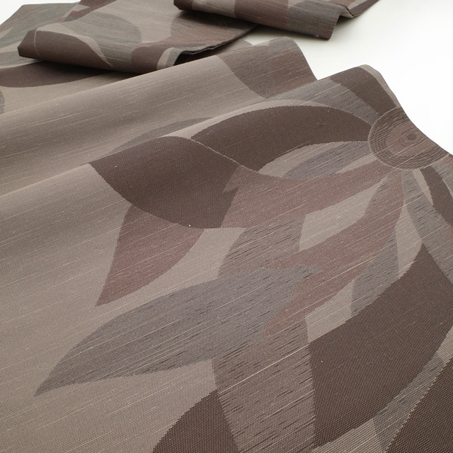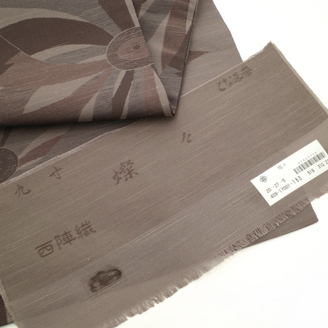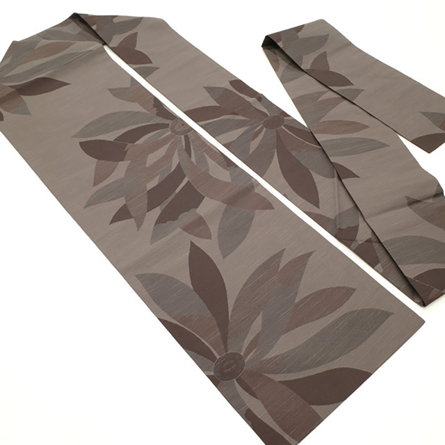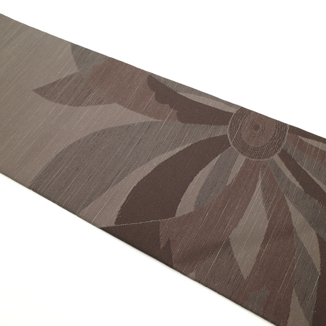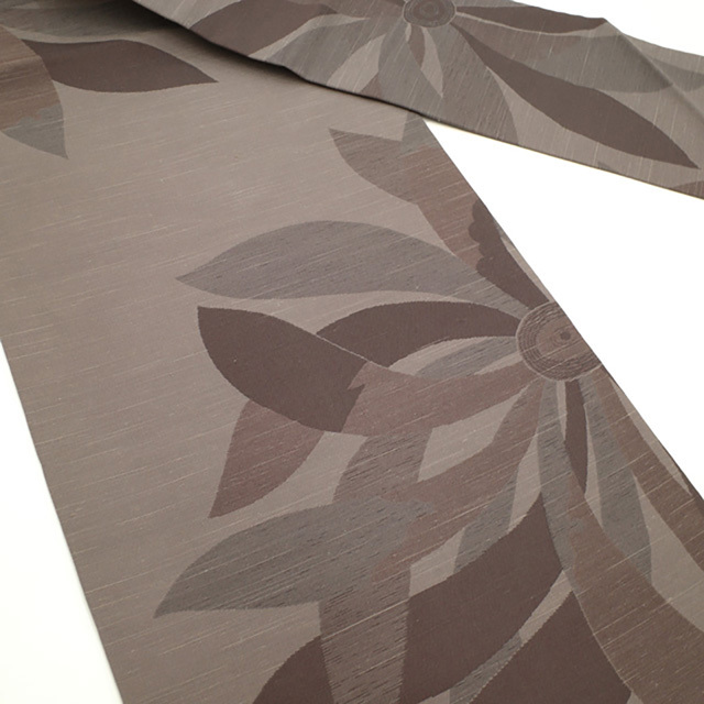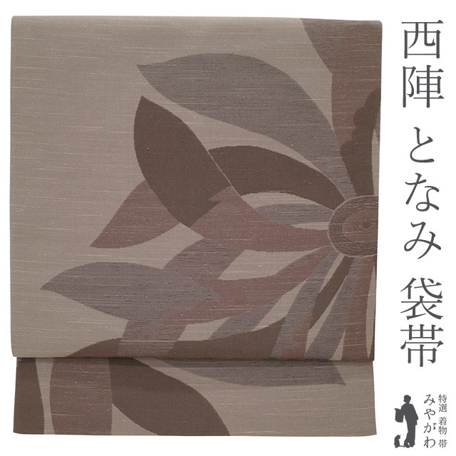 名古屋帯 九寸 西陣 となみ織物 紬 正絹 グレージュ 茶色 燦々 菊 草花 織り柄 花柄 カジュアル 新古品 仕立て上がり みやがわ sb52300