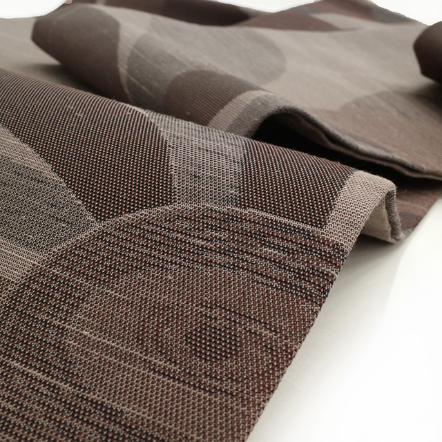 こちらのお品は、自然な節が浮くグレージュの紬地に「燦々」と名付けられたモダンでお洒落な菊柄が織りで愛らしく表現されております。