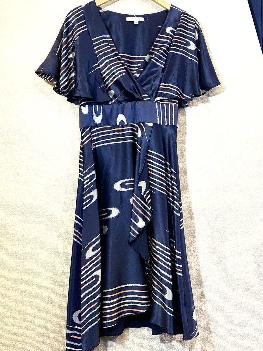光沢のあるネイビーカラーのシルク生地でできたカシュクールタイプのワンピースで、ビンテージ調の柄や色合いの綺麗なデザインになっています★