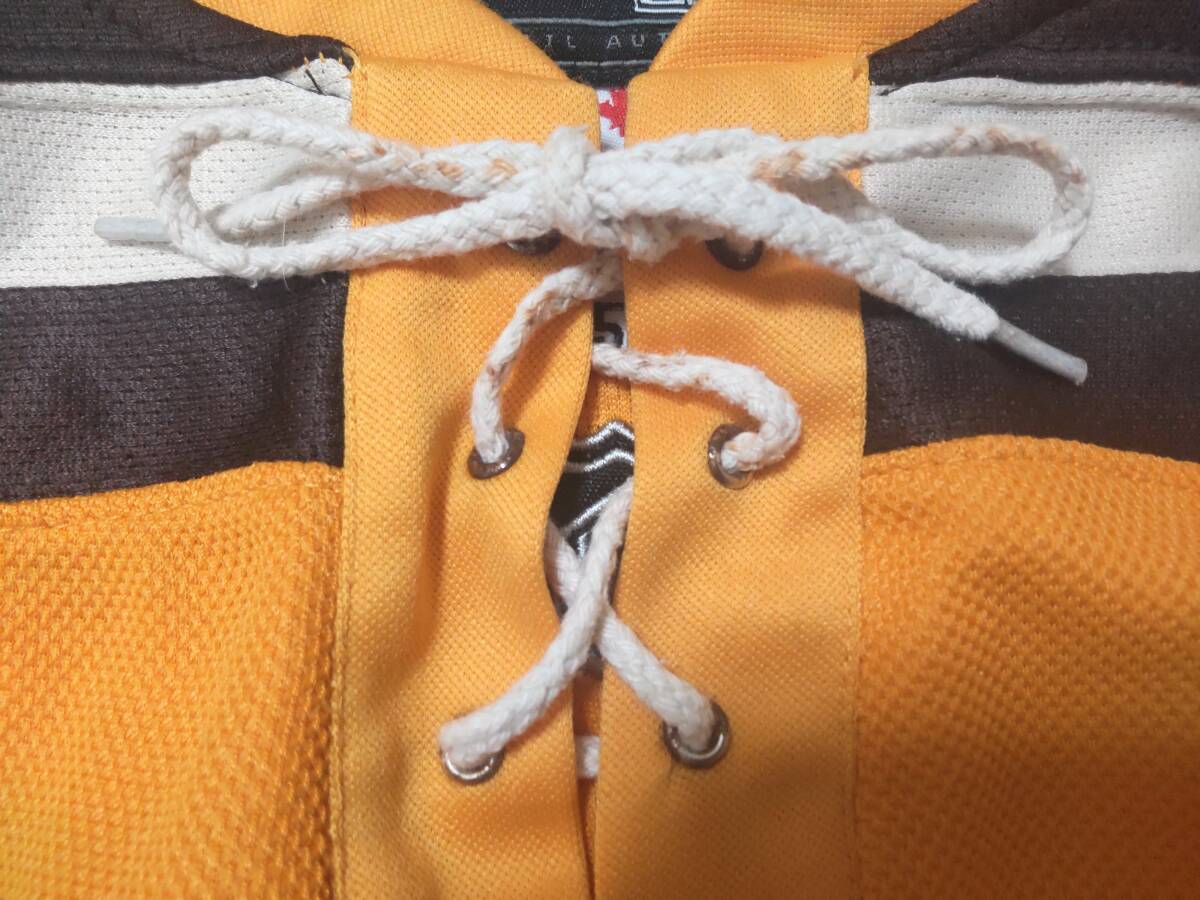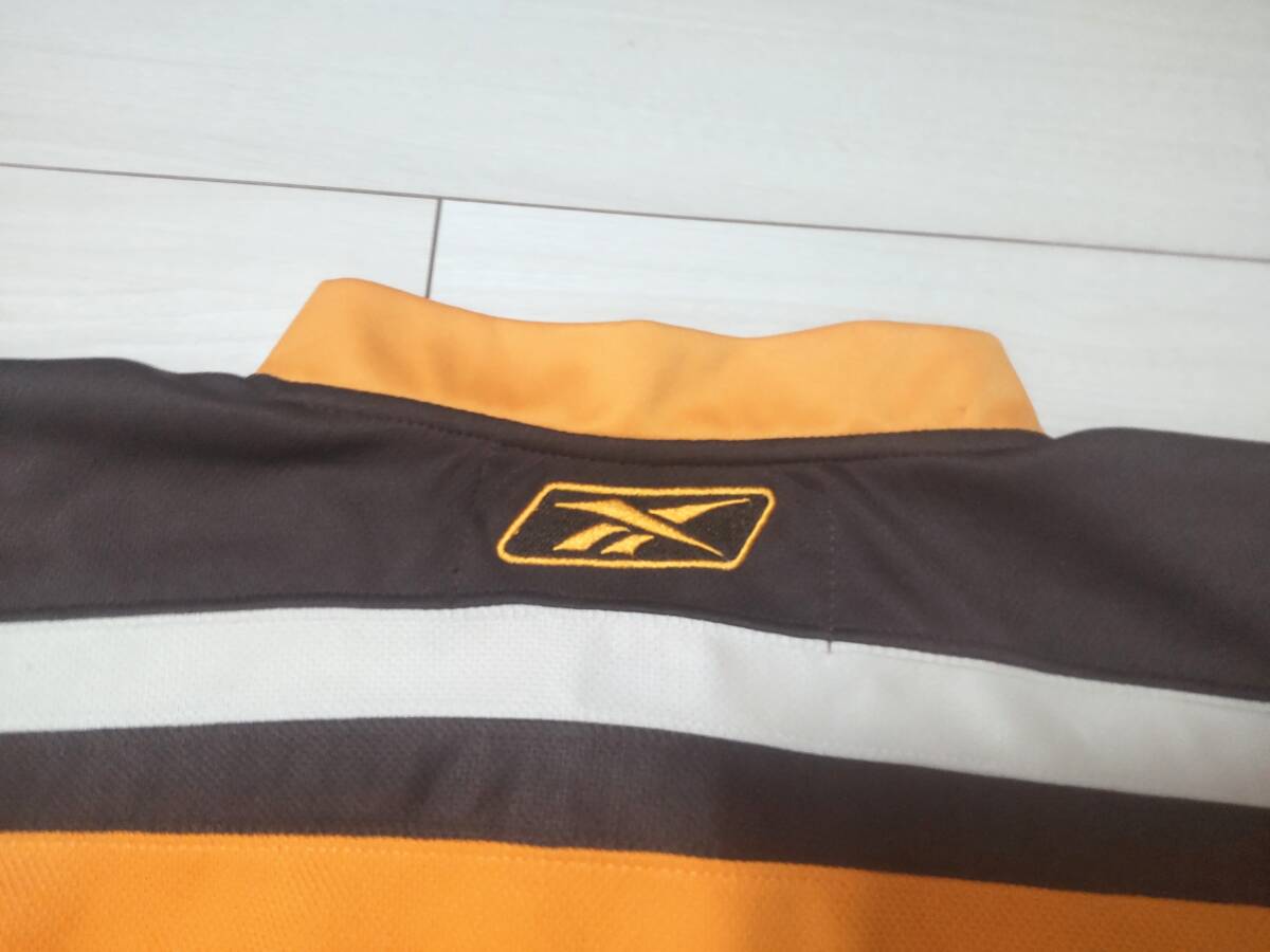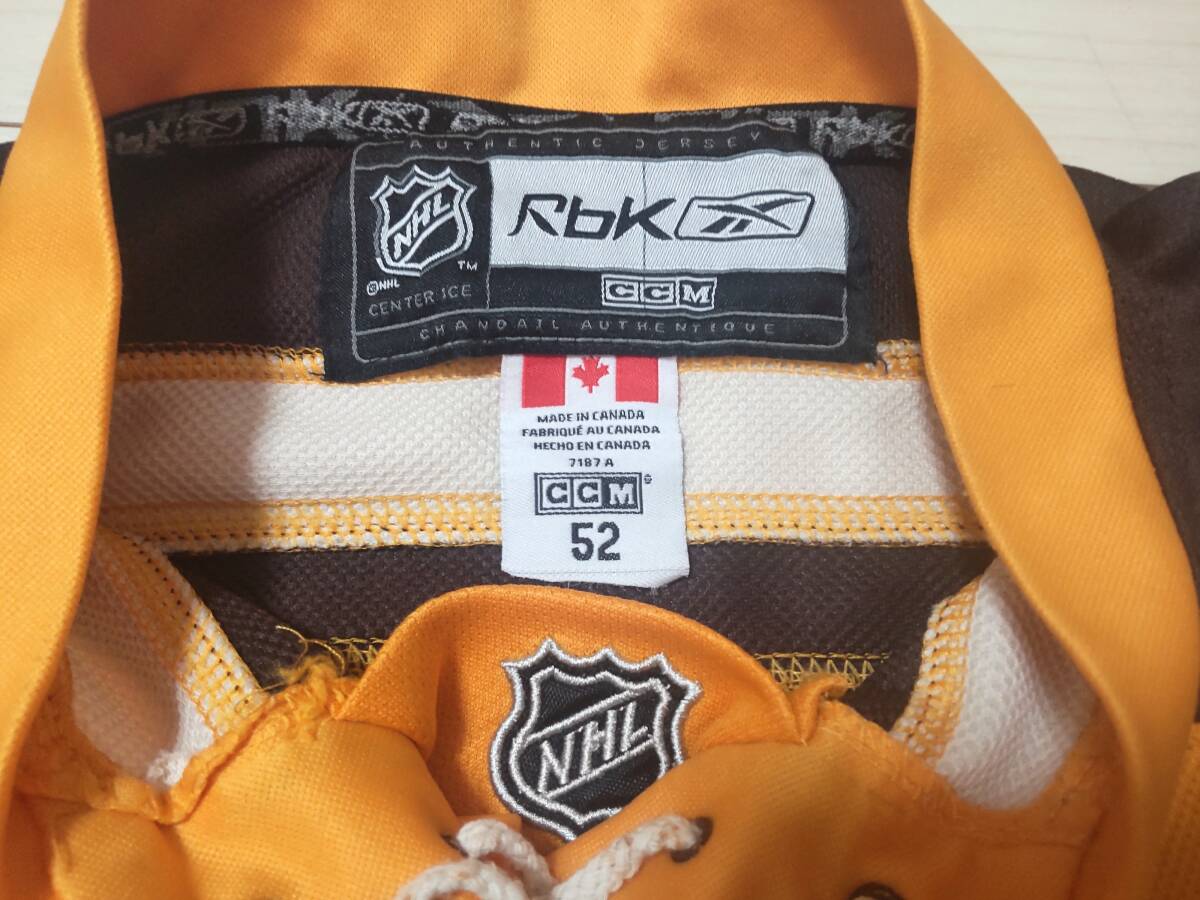 REEBOK(リーボック)社のアイスホッケージャージ(ユニフォーム)です ■NHL Boston Bruins(ボストン・ブルーインズ)のものです ■オーセンティックモデルになります ■サイズは52になります 素人採寸ですか 身幅(脇の下で)63cm 着丈(背面側で)78cm 裄丈87cm ありました ■カナダ製です ■正面にはブルーインズのエンブレムのワッペンが付いております ■右胸にはNHLのWinter CLASSICのワッペンが付いております ■ユーズドになりますので使用感があります いくつか特筆すべき点があります 1.全体的に細かな擦れがあります(一部は写真8.9枚目をご参照下さい)2.正面の「B」マークに汚れがあります(写真6枚目をご参照下さい)3.首元編み上げ部のレースに汚れと金属部に錆があります(写真10枚目をご参照下さい)■NHLのファンの方いかがでしょうか 是非よろしくお願い致します