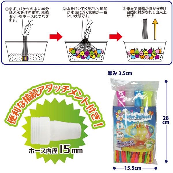 ホースについないで、水を入れるだけで37個の水風船のできあがり!