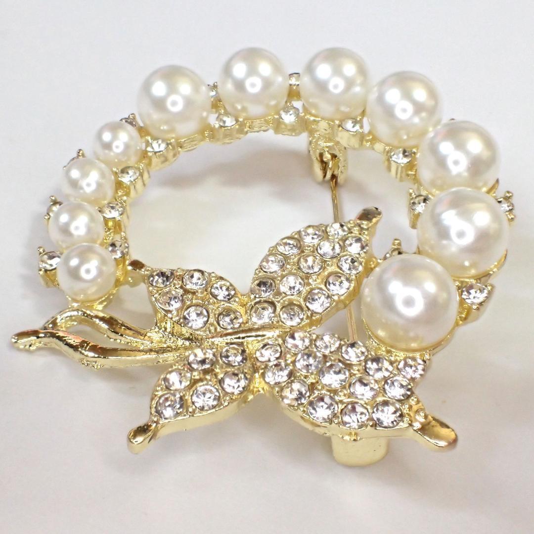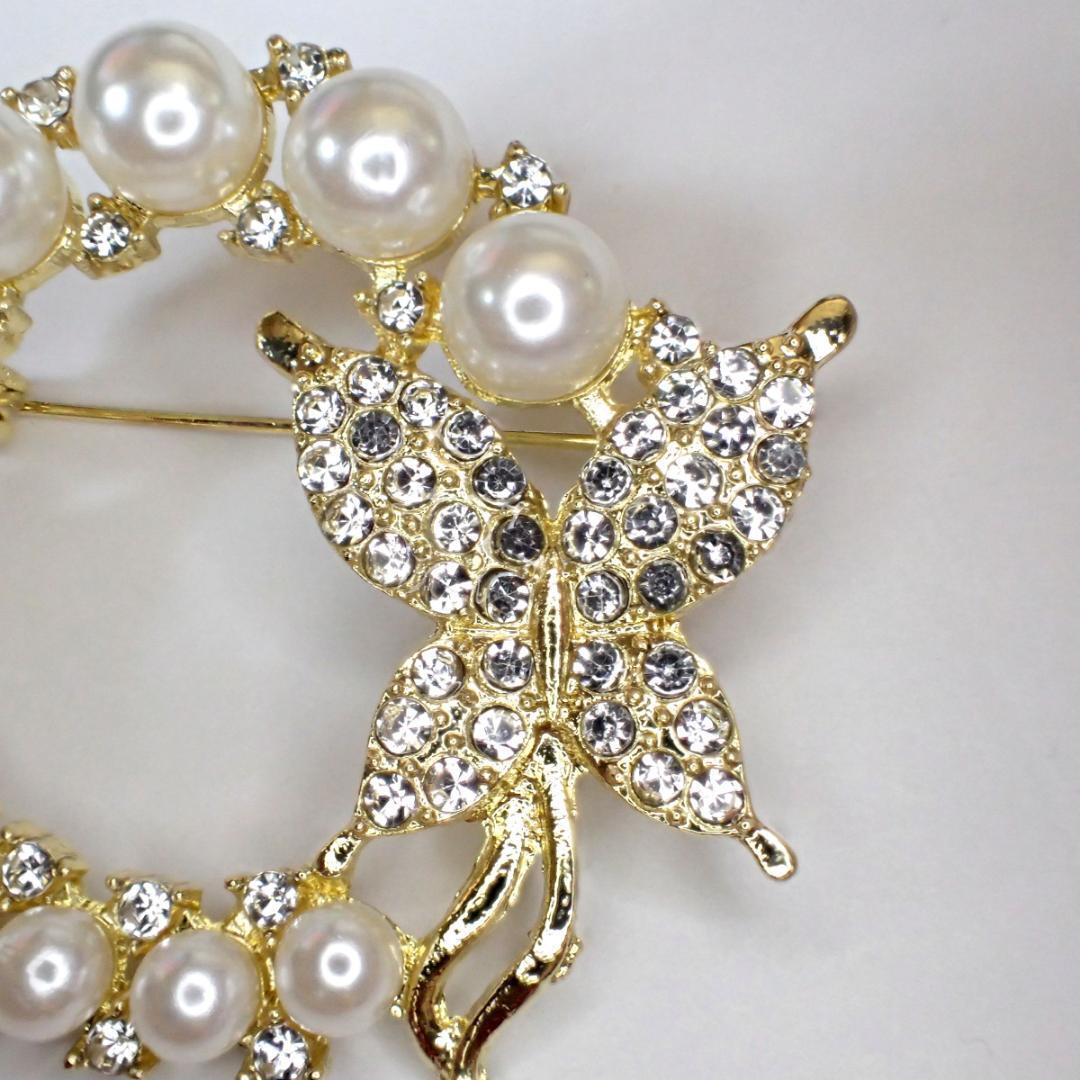 金色 ラインストーン 蝶 蝶々 人工パール 人工真珠 ピンブローチ ブローチ ピンバッジ バッジ ラペルピン