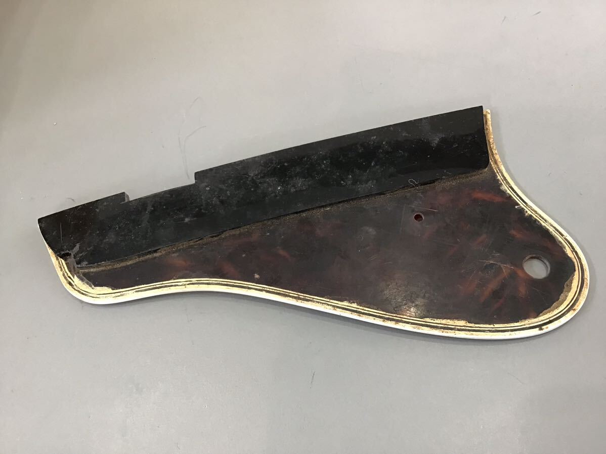 1962年製のジョニースミス シングル用 ピックガード です。独自のこの年代の雰囲気のセルロイド。少し汗をかくので若干劣化しています。少し反りがありますがポットなど付けること考えるとこれくらいの方がいいと思います。純正でダブルからシングルにしたい方 ディアルモンドなどで再構築したい方に