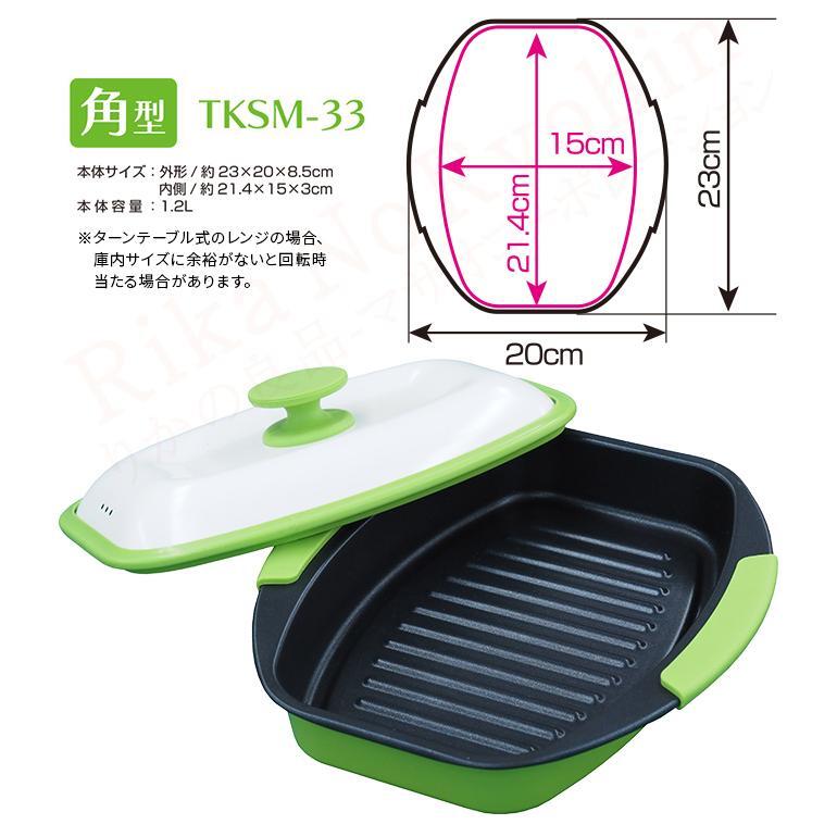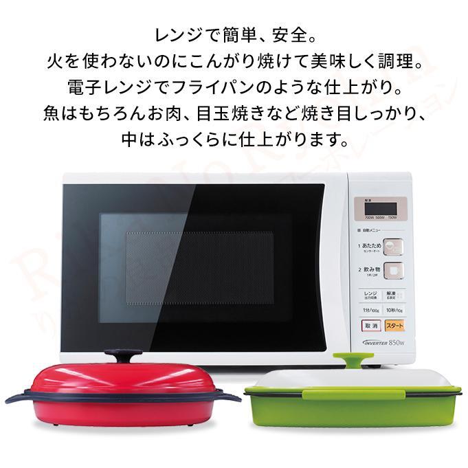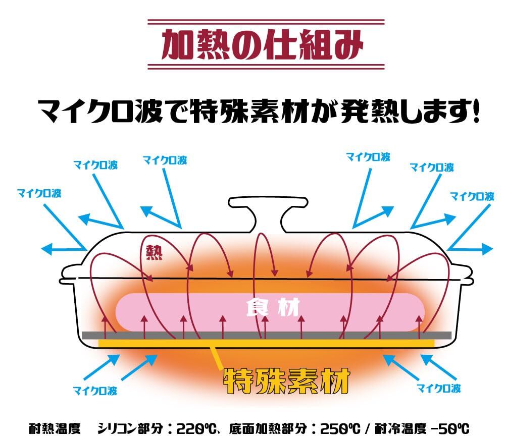 電子レンジのマイクロ波で底面の特殊素材が発熱します。マイクロ波を反射するフタをすることでレンジ使用時のように食材のパサつきを抑え全体に熱がいきわたるのでふっくらとした仕上がりになります。加熱加減により食材底面に焼き目が付きます。内側表面は焦げ付きにくいようにフッ素加工されています。