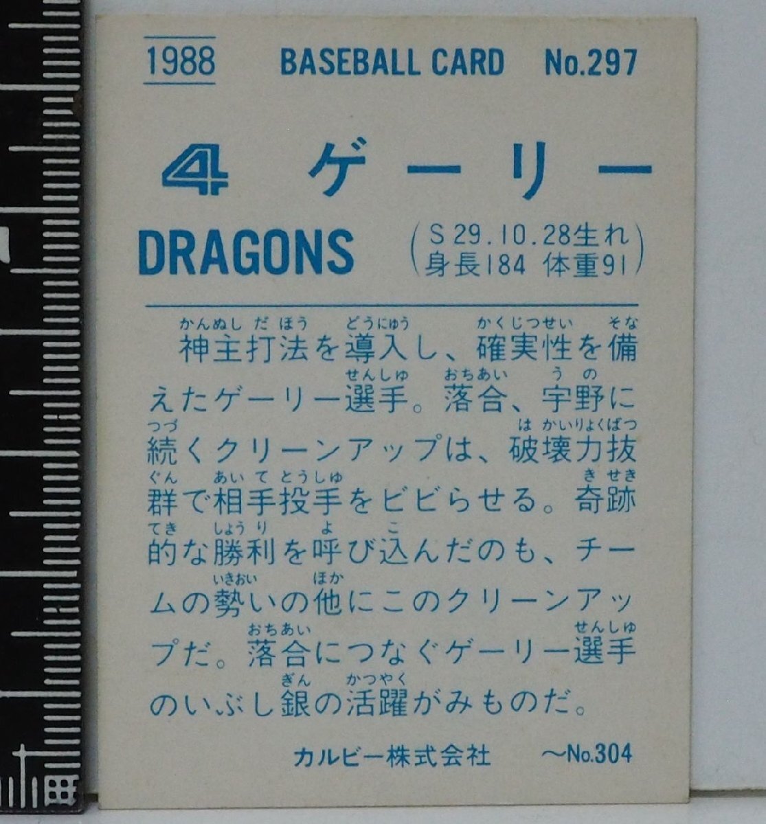 88年 カルビー プロ野球カード No.297【ゲーリー 中日ドラゴンズ】昭和63年 1988年 当時物 Calbeeおまけ食玩BASEBALL【中古】送料込