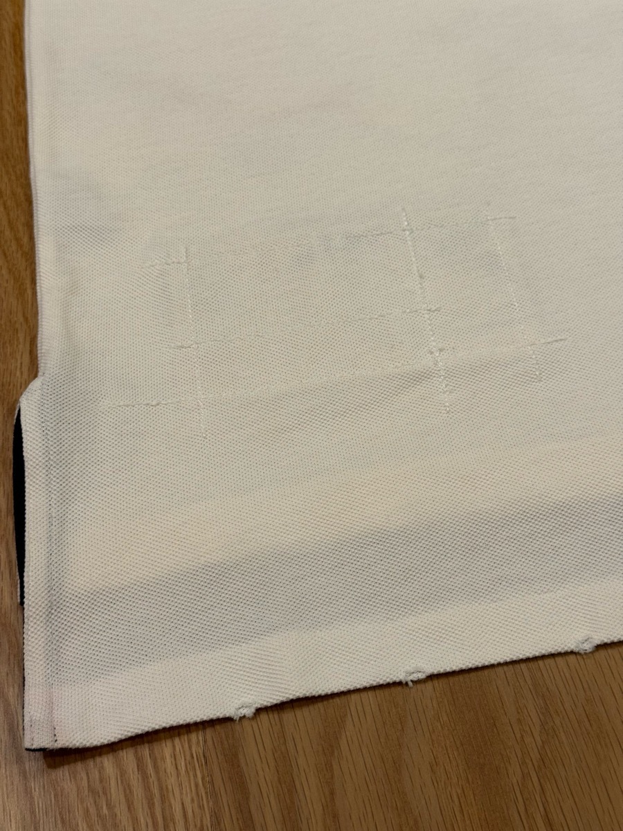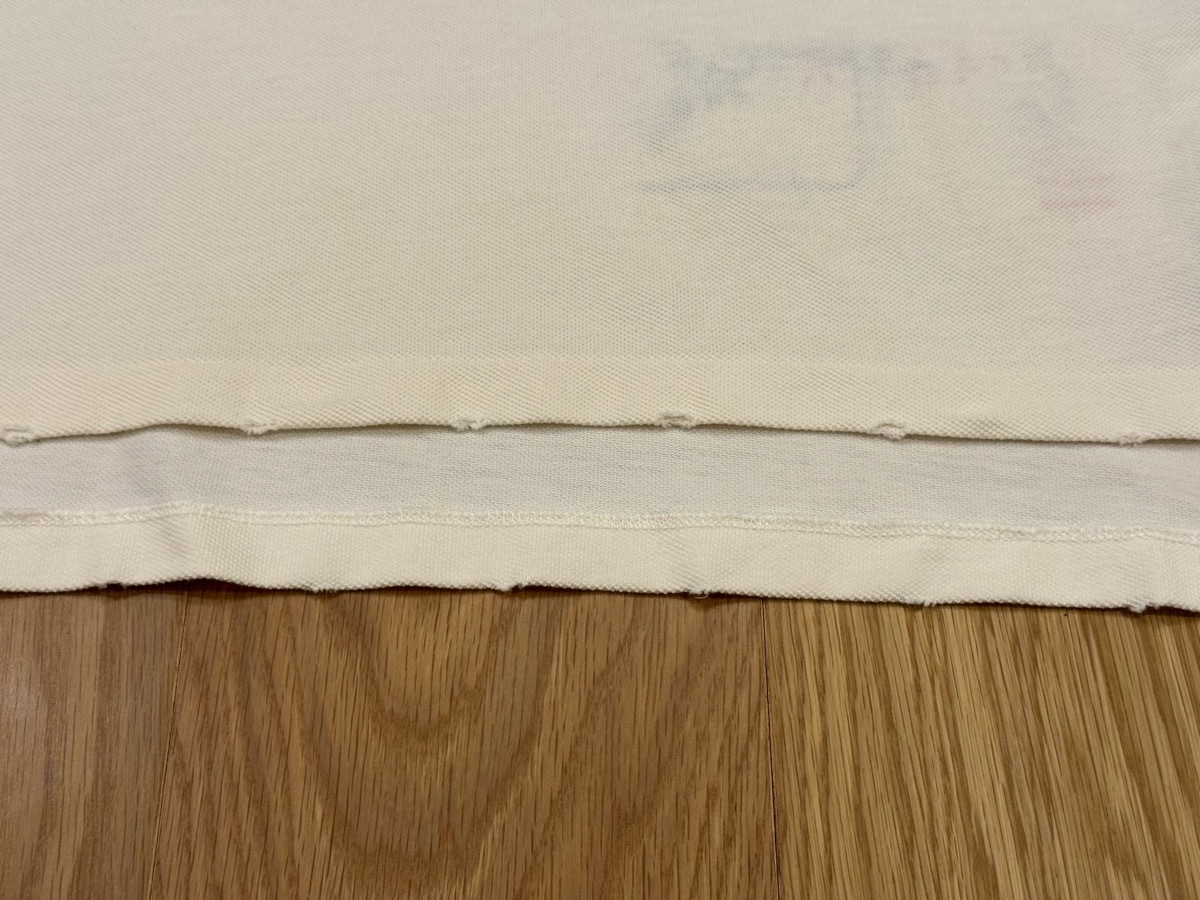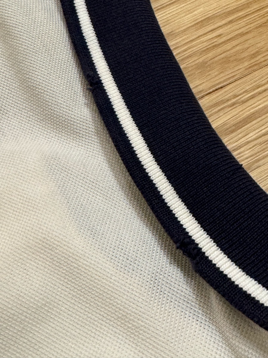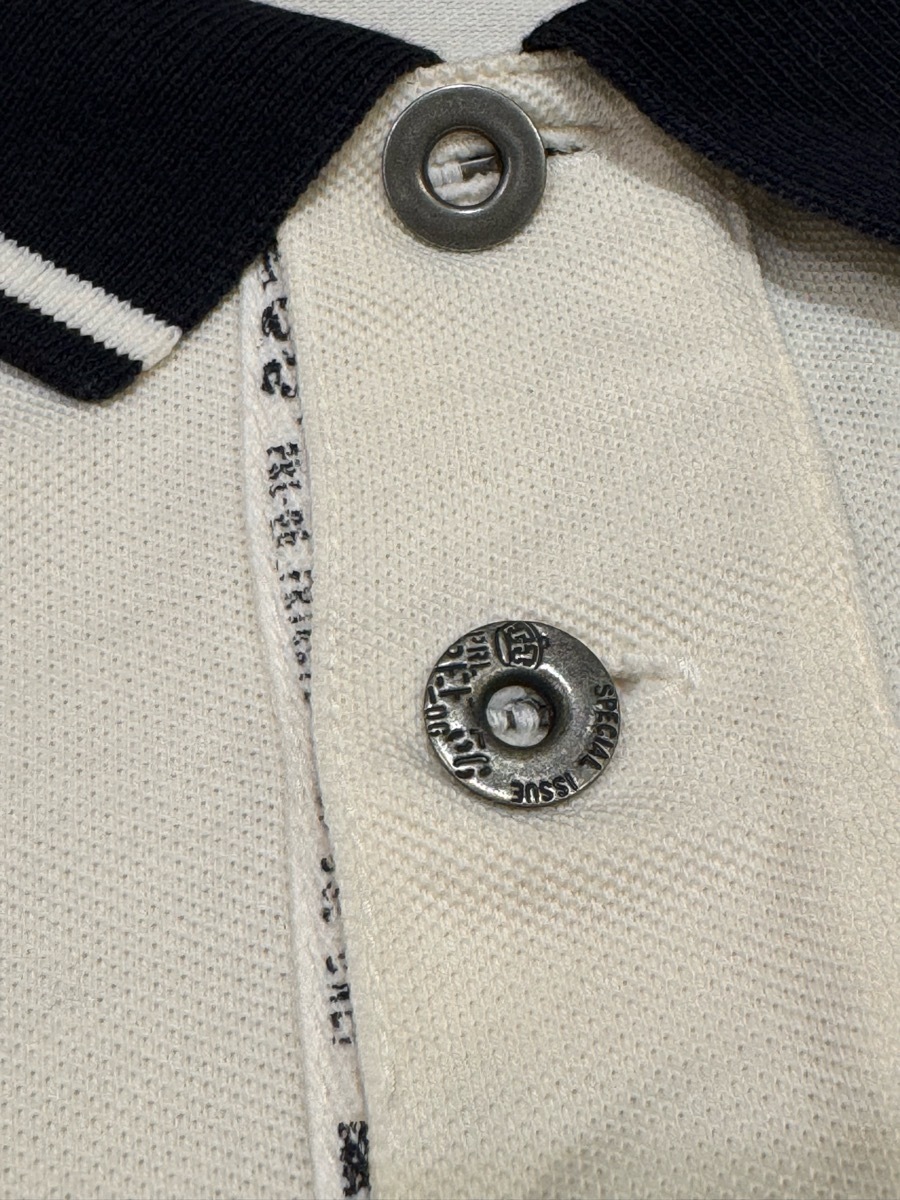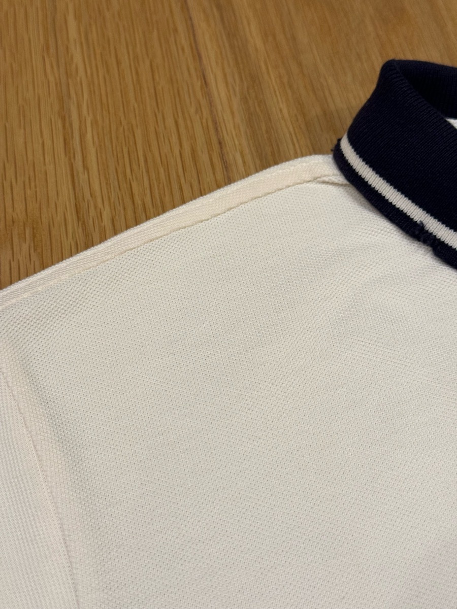 オフホワイト系の鹿の子ボディにネイビー襟のポロシャツになります。