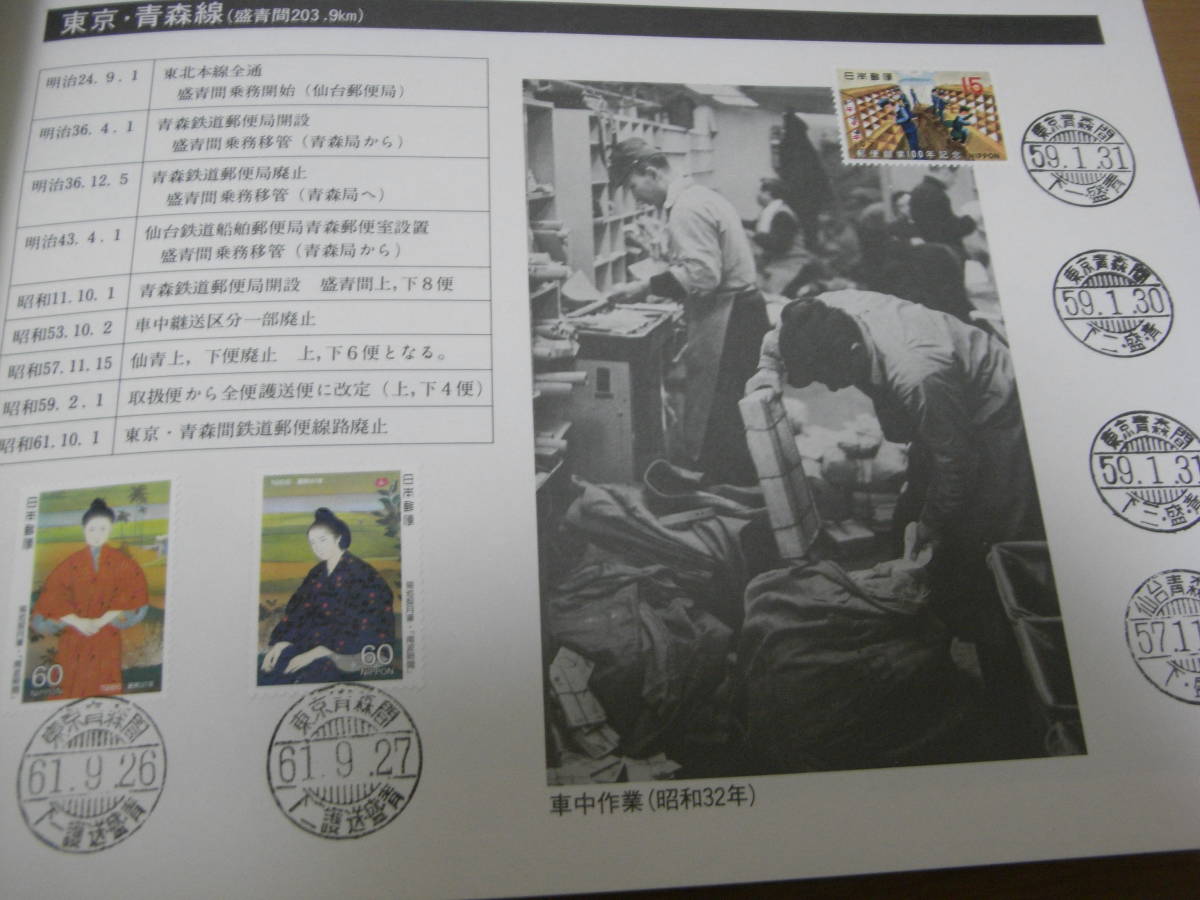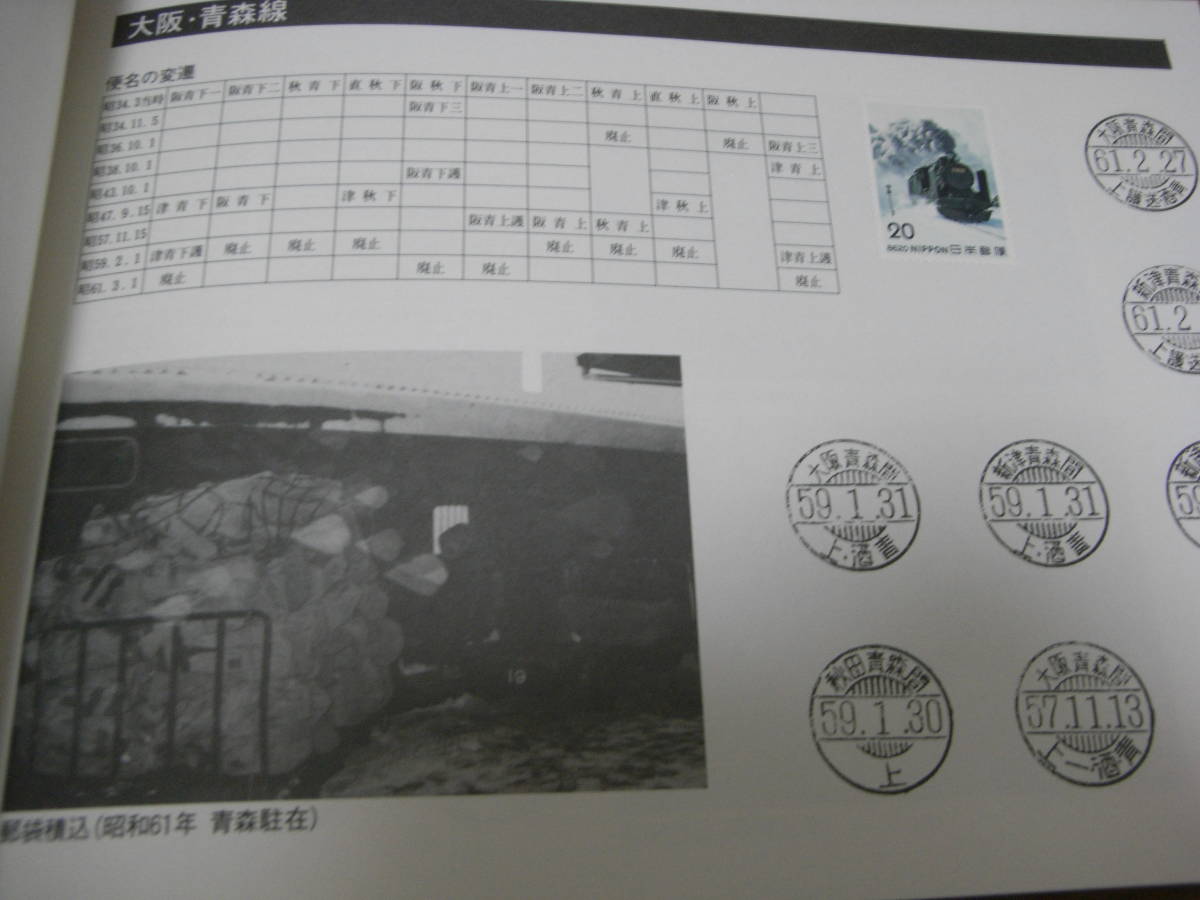10ページ・所掌線路と受渡局(昭和53.9当局)/東京・青森線、大阪・青森線、青森・函館線、能代・弘前線、大館・阿仁合線・野辺地・大畑線、青森・三厩線の歴史や消印などが掲載されています。青森鉄道郵便局が鉄道郵便局としての業務を終了する記念の発行です。各線最終日付印が多数掲載されておりますが、昭和61年9月の「青森 鉄道郵便」「東京・青森間」以外は印刷です。