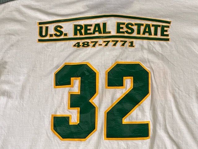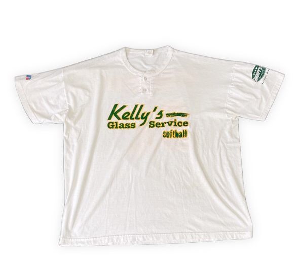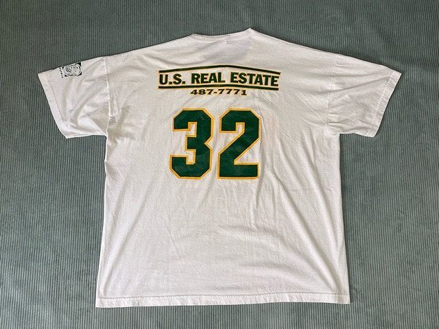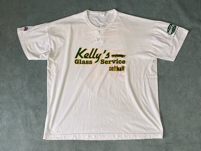 説明 | 90-00'sのラッセルのヘンリーネックTシャツ。 フロント・バック・レフトアームの3面ラバープリント。 グリーンにイエロートリムのラバープリントでナチュラボディによく合います。 表記XXLの00's頃のビッグシルエットで大き目のサイズ感です。 |