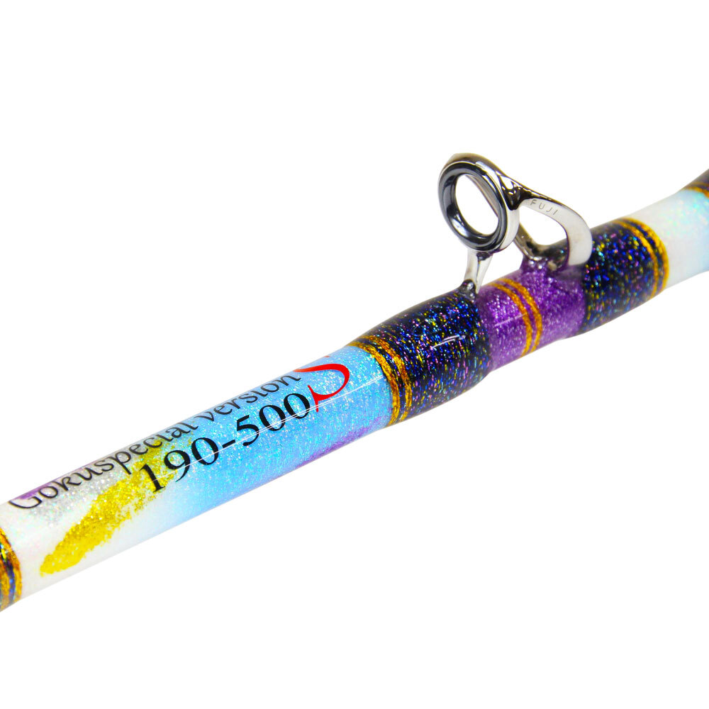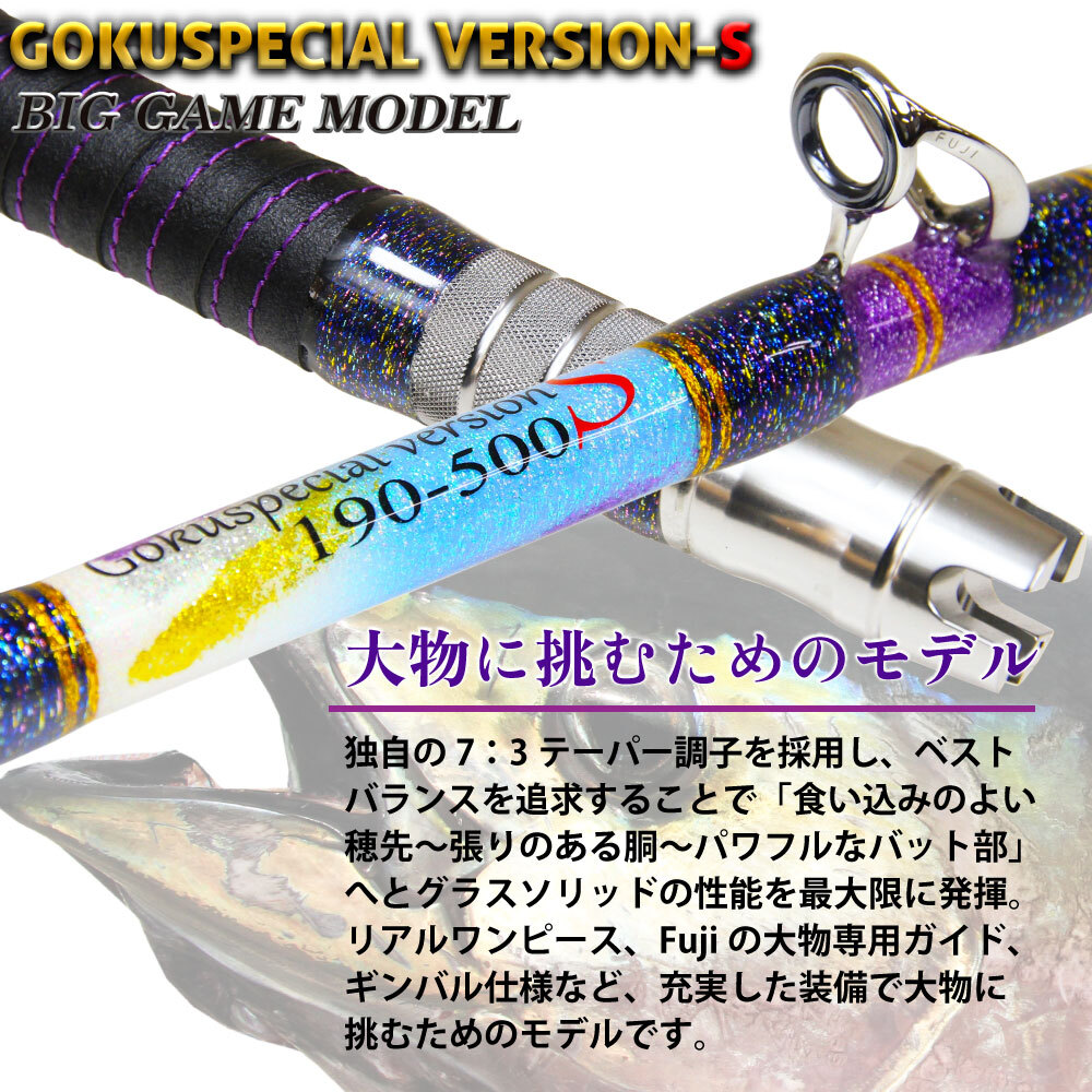 独自の7:3テーパー調子を採用し、ベストバランスを追求することで「食い込みのよい穂先~張りのある胴~パワフルなバット部」へとグラスソリッドの性能を最大限に発揮。 リアルワンピース、Fujiの大物専用ガイド、ギンバルなど、充実した装備で大物に挑むためのモデルです。 【190-500】 マグロ・クエ・カンパチなどの超大型魚を狙うために開発されたモデル。