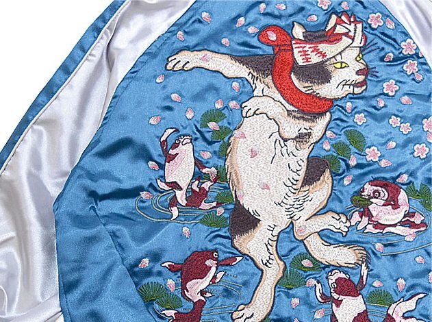 刺繍に定評のある古舗ブランド、華鳥風月の姉妹ブランド「朧」から「猫スカジャン/キッズ(9041894)」のご紹介です! 待望のキッズスカジャンが登場!! カジュアルなポリエステル生地を使用し、気軽にお楽しみ頂くことの出来るスカジャンを製作しました。 今回、モチーフの主役に採用されたのは【猫】柄。 | ||||||