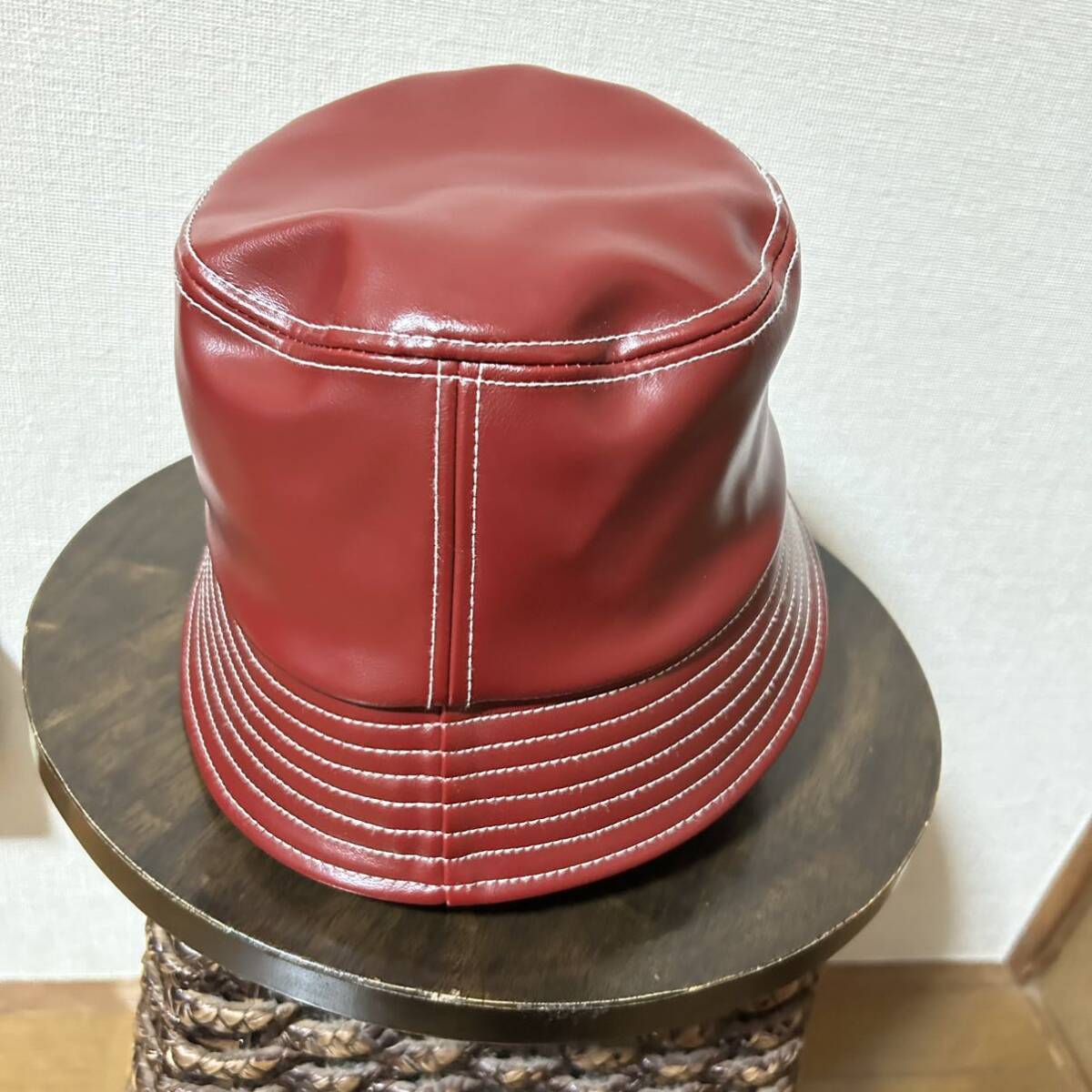 フェイクレザーの素材感が特徴的なバケットハット。