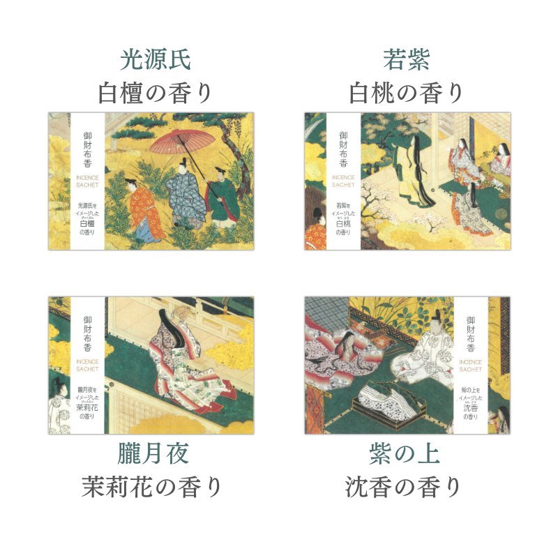 平安の匂いが4種です。解説付き OPP袋入り サイズ:5.4×8.2cm源氏物語の登場人物(光源氏、若紫、朧月夜、紫の上)からイメージした雅な香りをお気軽にお楽しみいただけるアイテムです。