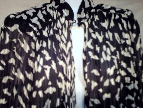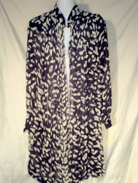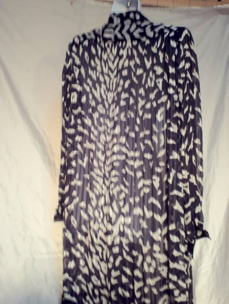 肩パット付きでスタンドカラーで首元プチキラボタン付きで肩下から細かめのプリーツラインが胸上まで流れるライン入りでシフォン系で透かし風でアニマル柄が大胆で細ラメストライプ入りでシルバーキラ②でとても素敵なロングの羽織系になります。長袖で袖口にもキラボタン付きです。パンツに合わせていただいたりシンプルなキャミロングワンピースの羽織などに・・・数回着用で自宅保管ありです。お色:ブラック・ホワイト 生地:ポリエステル100% 日本製 サイズ:9 着丈90 身幅45 肩幅40 袖丈56