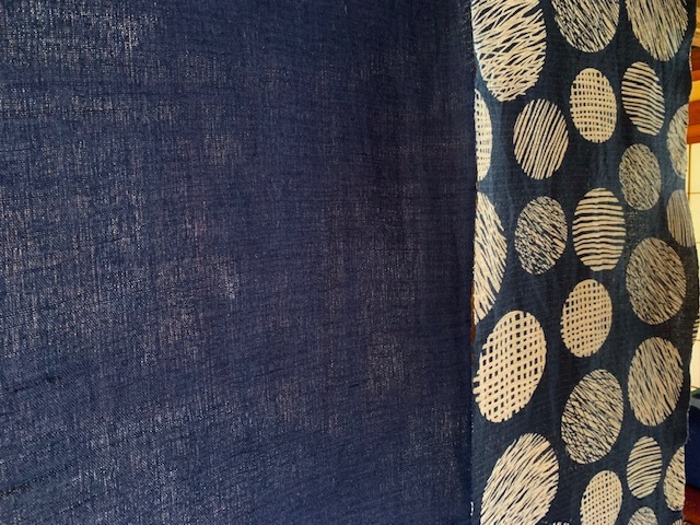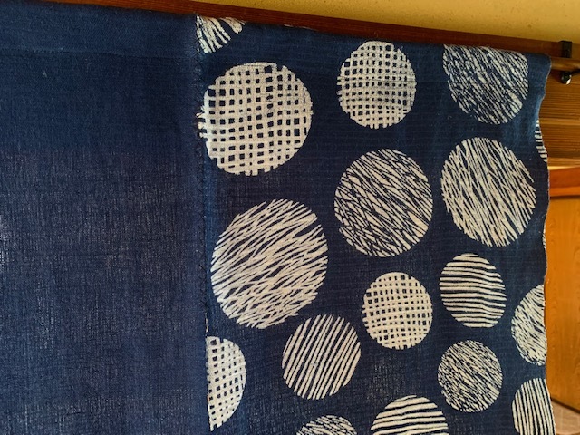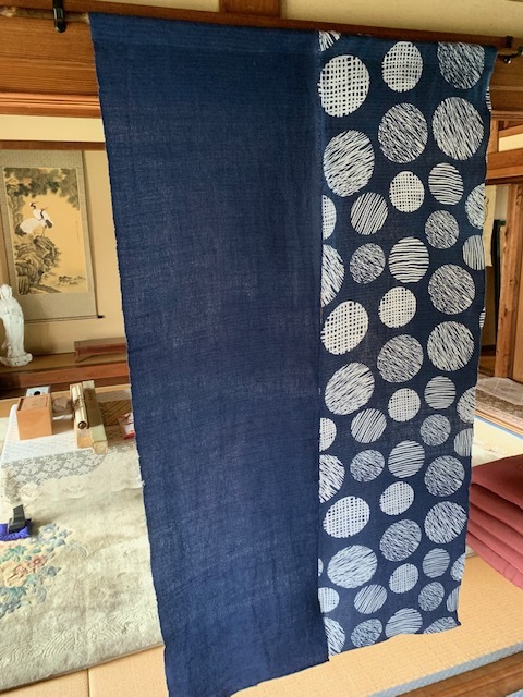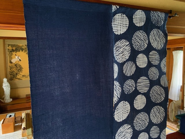 藍色の落ち着いた手染めで、レトロな感覚でお部屋も落ち着きます。