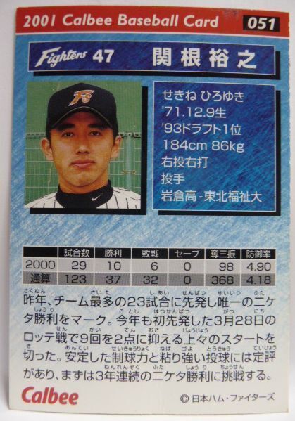 カルビープロ野球カード2001年#051【関根 裕之(日本ハム ファイターズ)】平成13年チップスおまけ食玩トレーディングカード【中古】送料込