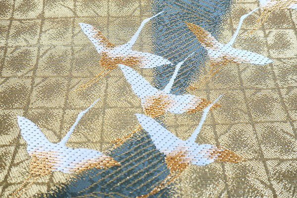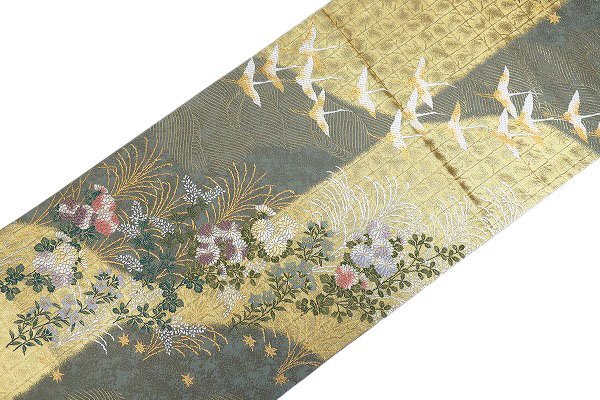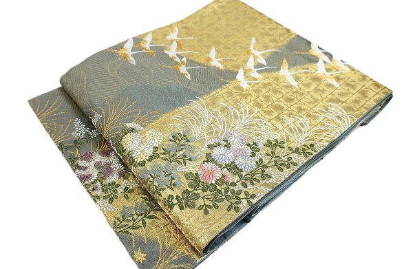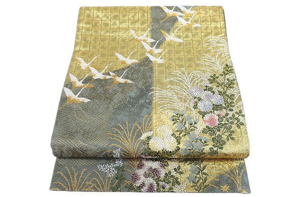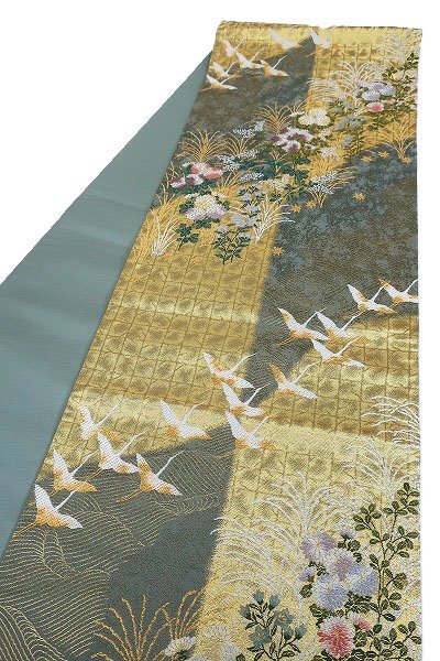 | 【送料無料】袋帯 鶴 菊 グリーンがかったグレー 金糸 4m38cm フォーマル お洒落 正絹 仕立て上がり m-5913 |