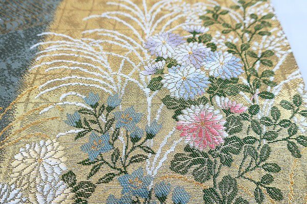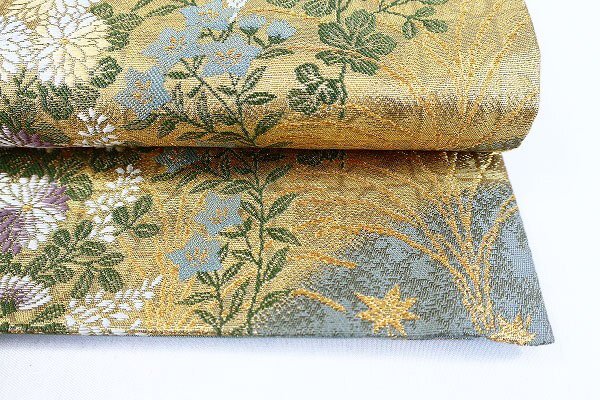 グリーンがかったグレー地に、鶴や菊などの花文が織り込まれた袋帯です。 金糸があしらわれ、品がありながらも豪華な一本です。 |
